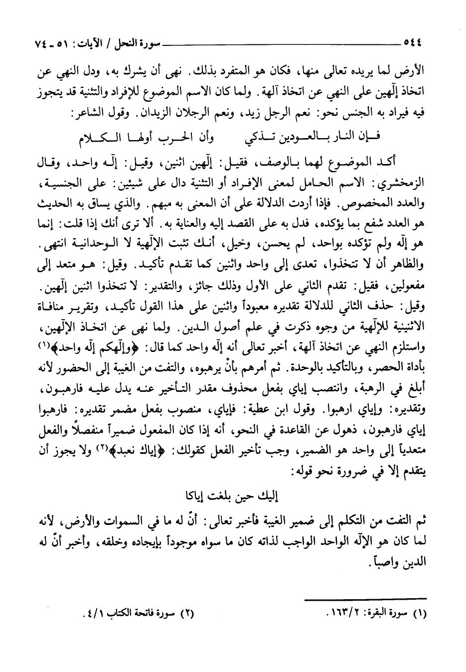 الْأَرْضِ لِمَا يُرِيدُهُ تَعَالَى مِنْهَا، فَكَانَ هُوَ الْمُتَفَرِّدَ بِذَلِكَ. نَهَى أَنْ يُشْرَكَ بِهِ، وَدَلَّ النَّهْيُ عَنِ اتِّخَاذِ إِلَهَيْنِ عَلَى النَّهْيِ عَنِ اتِّخَاذِ آلِهَةٍ. وَلَمَّا كَانَ الِاسْمُ الْمَوْضُوعُ لِلْإِفْرَادِ وَالتَّثْنِيَةِ قَدْ يُتَجَوَّزُ فِيهِ فَيُرَادُ بِهِ الْجِنْسُ نَحْوَ: نِعْمَ الرَّجُلُ زَيْدٌ، وَنِعْمَ الرَّجُلَانِ الزَّيْدَانِ. وَقَوْلُ الشَّاعِرِ: