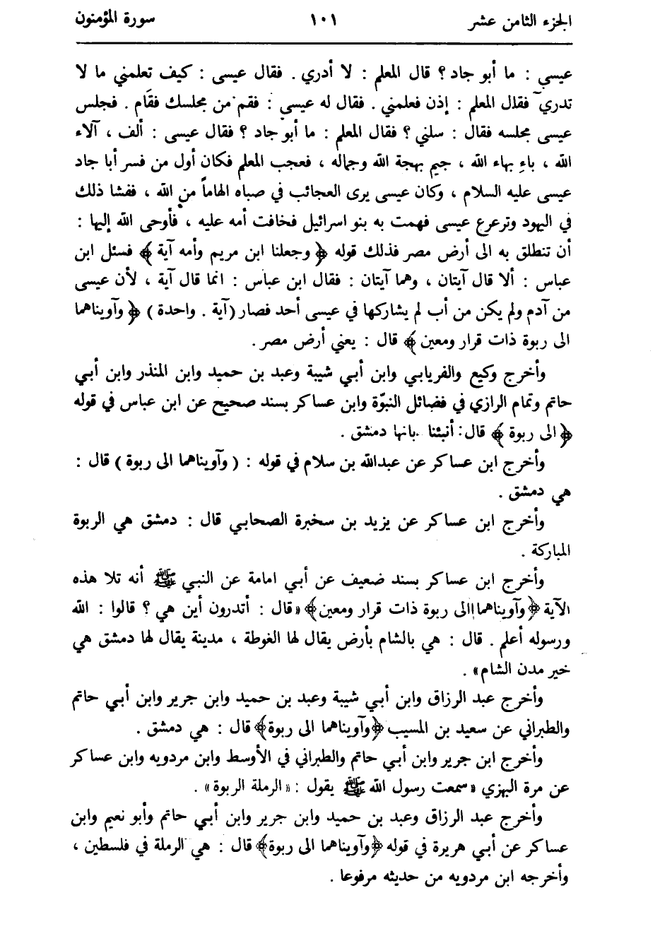 وَأخرج وَكِيع وَالْفِرْيَابِي وَابْن أبي شيبَة وَعبد بن حميد وَابْن الْمُنْذر وَابْن أبي حَاتِم وَتَمام الرَّازِيّ فِي فَضَائِل النبوّة وَابْن عَسَاكِر بِسَنَد صَحِيح عَن ابْن عَبَّاس فِي قَوْله {إِلَى ربوة} قَالَ: أنبئنا بِأَنَّهَا دمشق