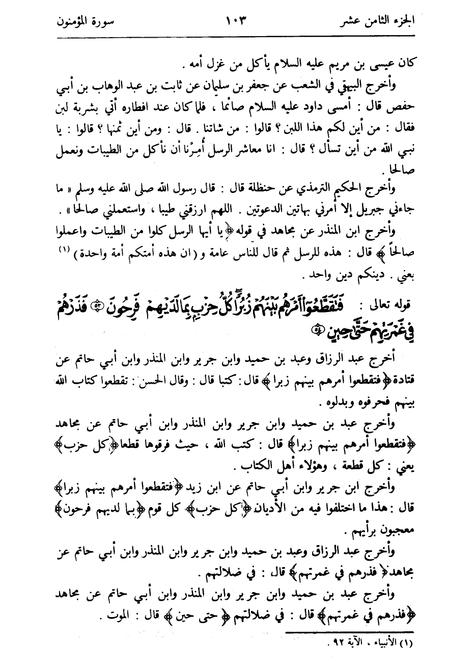 - قَوْله تَعَالَى: فتقطعوا أَمرهم بَينهم زبرا كل حزب بِمَا لديهم فَرِحُونَ فذرهم فِي غمرتهم حَتَّى حِين