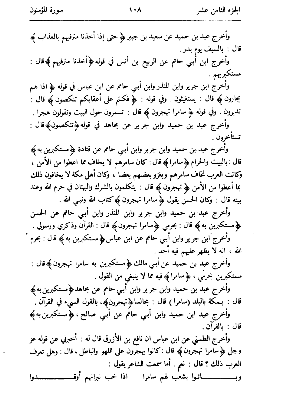 وَأخرج عبد بن حميد وَابْن جرير وَابْن أبي حَاتِم عَن مُجَاهِد {مستكبرين بِهِ} قَالَ: بِمَكَّة بِالْبَلَدِ (سامرا) قَالَ: مجالساً {تهجرون} بالْقَوْل السيء فِي الْقُرْآن