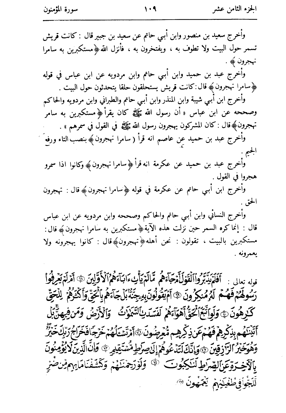 وَأخرج سعيد بن مَنْصُور وَابْن أبي حَاتِم عَن سعيد بن جُبَير قَالَ: كَانَت قُرَيْش تسمر حول الْبَيْت وَلَا تَطوف بِهِ ويفتخرون بِهِ فَأنْزل الله {مستكبرين بِهِ سامراً تهجرون}
