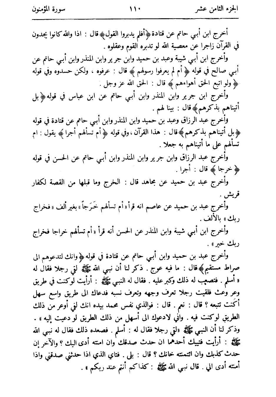 وَأخرج عبد الرَّزَّاق وَعبد بن حميد وَابْن الْمُنْذر وَابْن أبي حَاتِم عَن قَتَادَة فِي قَوْله {بل أتيناهم بذكرهم} قَالَ: هَذَا الْقُرْآن وَفِي قَوْله {أم تَسْأَلهُمْ أجرا} يَقُول: أم تَسْأَلهُمْ على مَا أتيناهم بِهِ جعلا