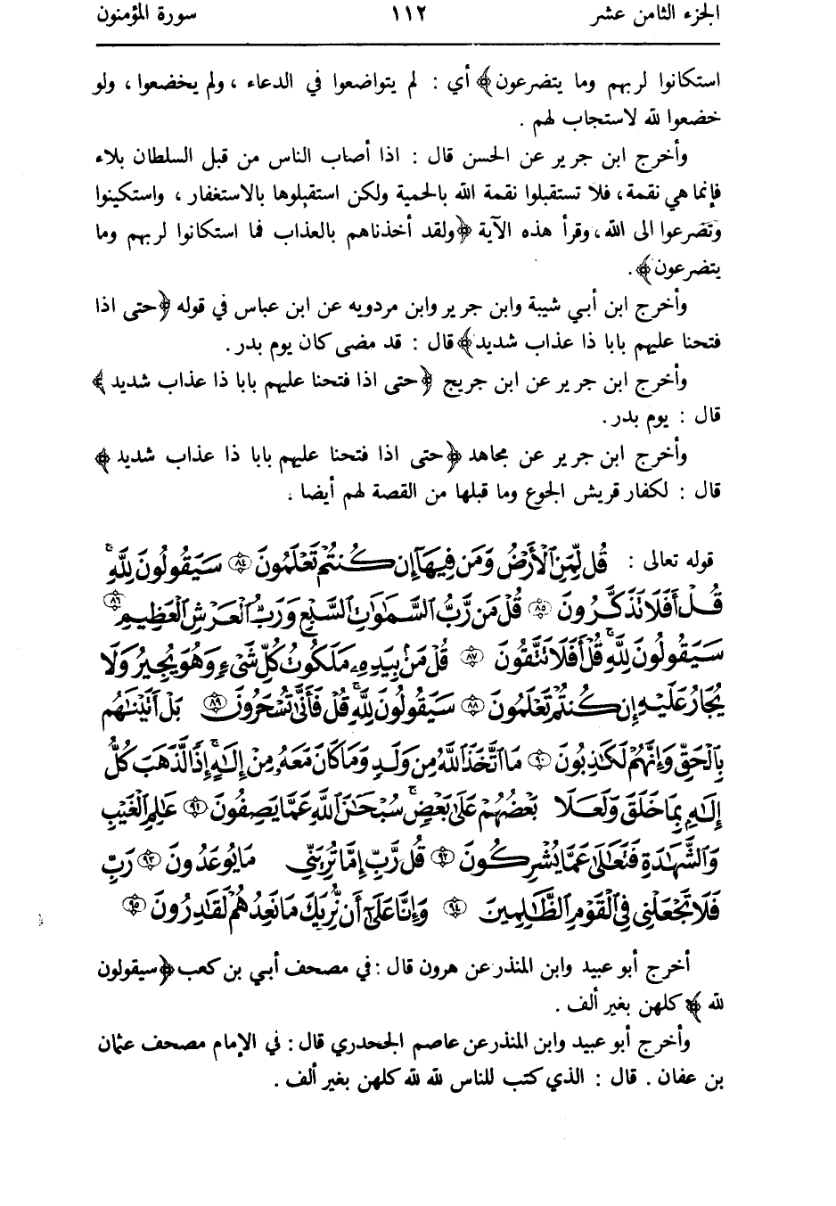 - قَوْله تَعَالَى: قل لمن الأَرْض وَمن فِيهَا إِن كُنْتُم تعلمُونَ سيقولون لله قل أَفلا تذكرُونَ قل من رب السَّمَوَات السَّبع وَرب الْعَرْش الْعَظِيم سيقولون لله قل أَفلا تَتَّقُون قل من بِيَدِهِ ملكوت كل شَيْء وَهُوَ يجير وَلَا يجار عَلَيْهِ إِن كُنْتُم تعلمُونَ سيقولون لله قل فَأنى تسحرون بل آتَيْنَاهُم بِالْحَقِّ وَإِنَّهُم لَكَاذِبُونَ مَا اتخذ الله من ولد وَمَا كَانَ مَعَه من إِلَه إِذا لذهب كل إِلَه بِمَا خلق ولعلى بَعضهم على بعض سُبْحَانَ الله عَمَّا يصفونَ عَالم الْغَيْب وَالشَّهَادَة فتعالى الله عَمَّا يشركُونَ قل رب إِمَّا تريني مَا يوعدون رب فَلَا تجعلني فِي الْقَوْم الظَّالِمين وَإِنَّا على أَن نريك مَا نعدهم لقادرون