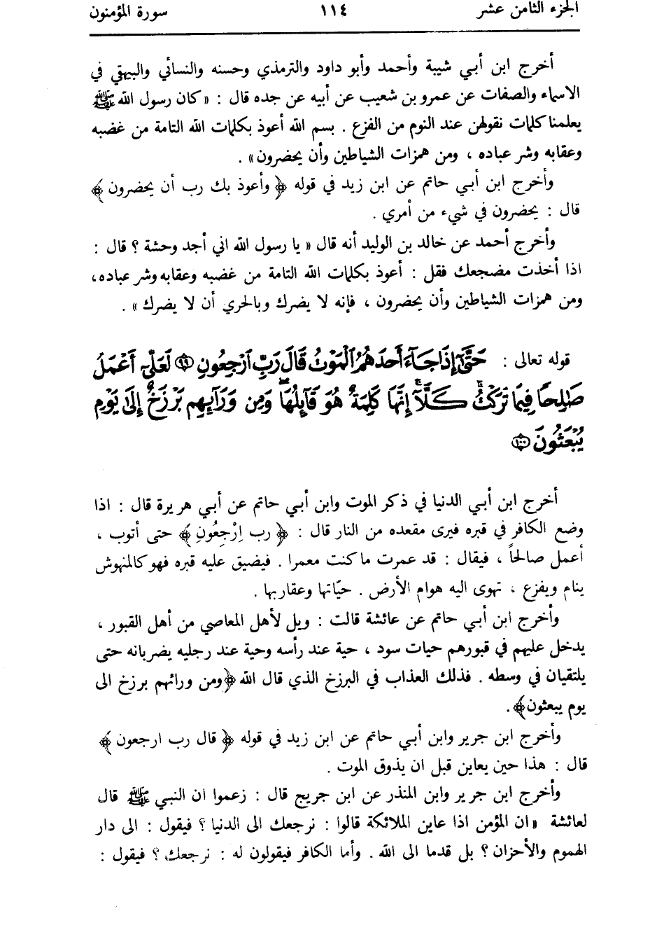 - قَوْله تَعَالَى: حَتَّى إِذا جَاءَ أحدهم الْمَوْت قَالَ رب ارْجِعُونِ لعَلي أعمل صَالحا فِيمَا تركت كلا إِنَّهَا كلمة هُوَ قَائِلهَا وَمن ورائهم برزخ إِلَى يَوْم يبعثون