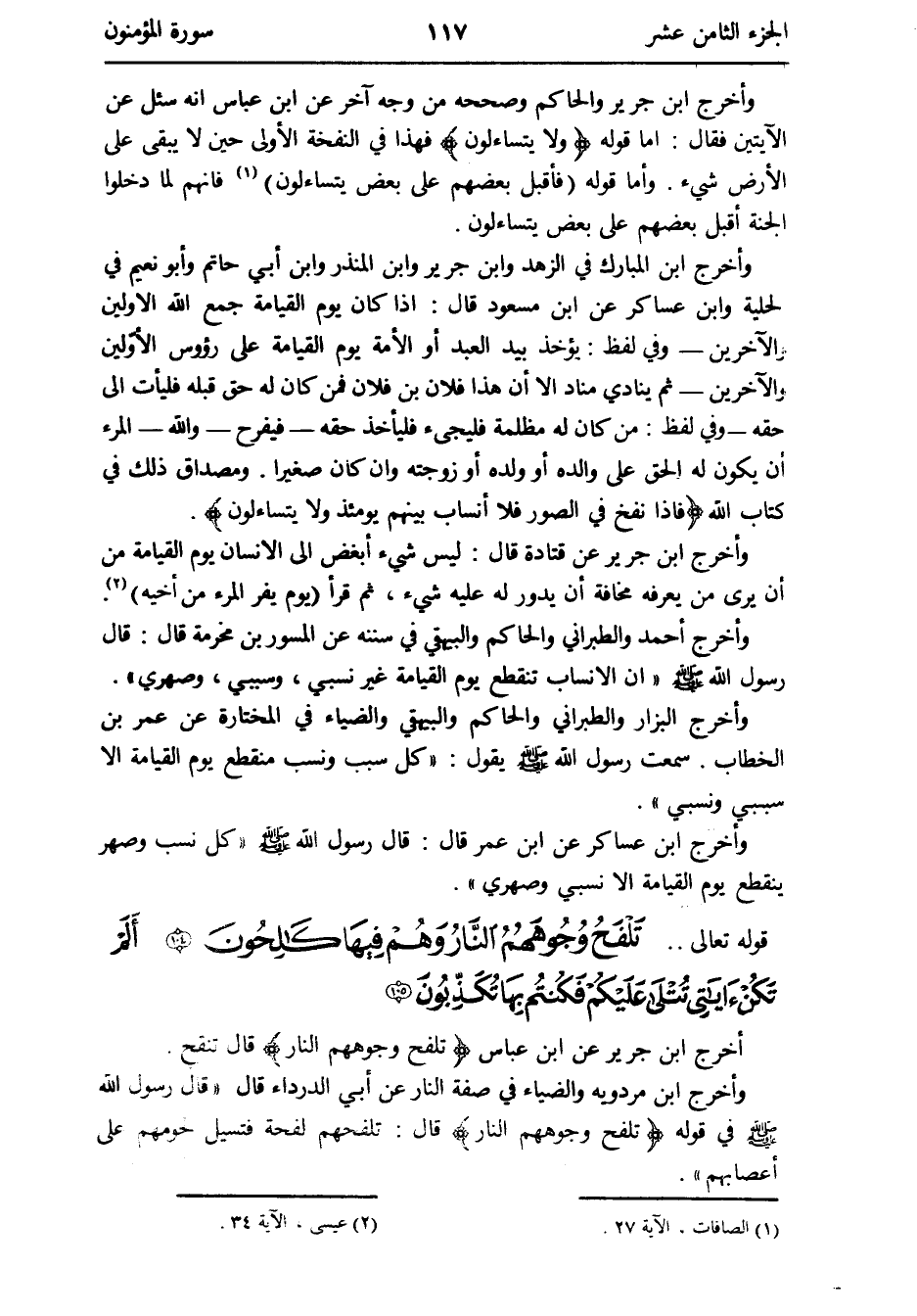 وَأخرج ابْن جرير وَالْحَاكِم وَصَححهُ من وَجه آخر عَن ابْن عَبَّاس أَنه سُئِلَ عَن الْآيَتَيْنِ فَقَالَ: أما قَوْله {وَلَا يتساءلون} فَهَذَا فِي النفخة الأولى حِين لَا يبْقى على الأَرْض شَيْء