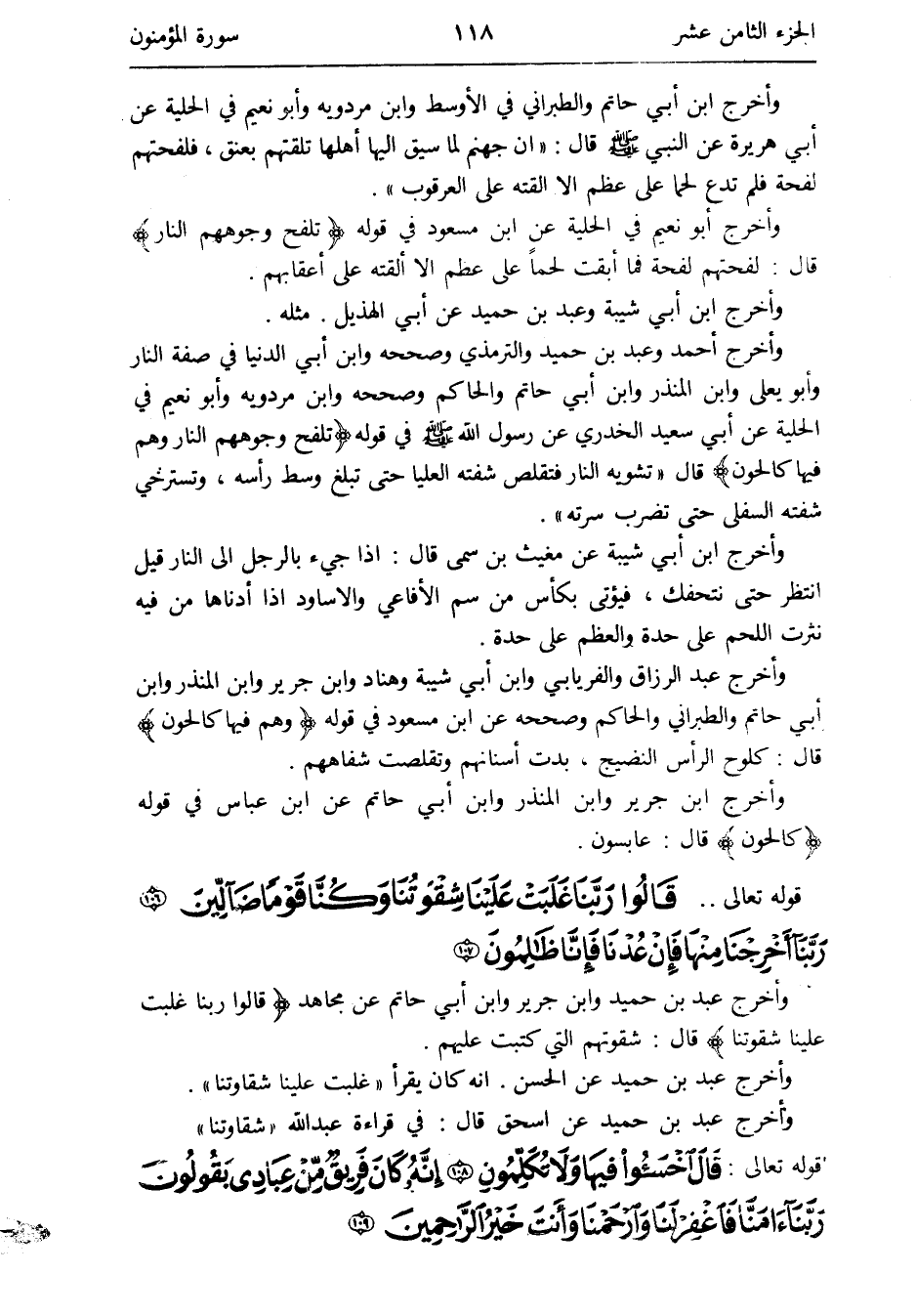 وَأخرج أَحْمد وَعبد بن حميد وَالتِّرْمِذِيّ وَصَححهُ وَابْن أبي الدُّنْيَا فِي صفة النَّار وَأَبُو يعلى وَابْن الْمُنْذر وَابْن أبي حَاتِم وَالْحَاكِم وَصَححهُ وَابْن مرْدَوَيْه وَأَبُو نعيم فِي الْحِلْية عَن أبي سعيد الْخُدْرِيّ عَن رَسُول الله صلى الله عَلَيْهِ وَسلم فِي قَوْله {تلفح وُجُوههم النَّار وهم فِيهَا كَالِحُونَ} قَالَ تَشْوِيه النَّار فتقلص شفته الْعليا حَتَّى تبلغ وسط رَأسه وَتَسْتَرْخِي شفته السُّفْلى حَتَّى تضرب سرته