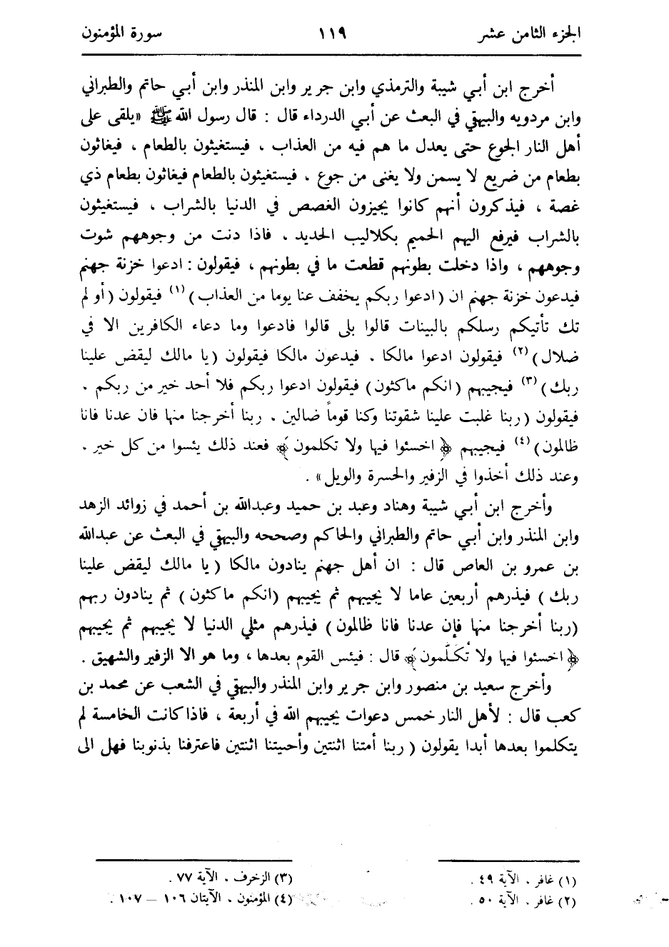 وَأخرج ابْن أبي شيبَة وهناد وَابْن أبي حَاتِم بن أَحْمد فِي زَوَائِد الزّهْد وَابْن الْمُنْذر وَابْن أبي حَاتِم وَالطَّبَرَانِيّ وَالْحَاكِم وَصَححهُ وَالْبَيْهَقِيّ فِي الْبَعْث عَن عبد الله بن عَمْرو بن الْعَاصِ قَالَ: إِن أهل جَهَنَّم ينادون مَالِكًا {يَا مَالك ليَقْضِ علينا رَبك} فيذرهم أَرْبَعِينَ عَاما لَا يُجِيبهُمْ ثمَّ يُجِيبهُمْ {إِنَّكُم مَاكِثُونَ} ثمَّ ينادون رَبهم {رَبنَا أخرجنَا مِنْهَا فَإِن عدنا فانا ظَالِمُونَ} فيذرهم مثلي الدُّنْيَا لَا يُجِيبهُمْ ثمَّ يُجِيبهُمْ {اخسؤوا فِيهَا وَلَا تُكَلِّمون} قَالَ: فيئس الْقَوْم بعْدهَا وَمَا هُوَ إِلَّا الزَّفِير والشهيق