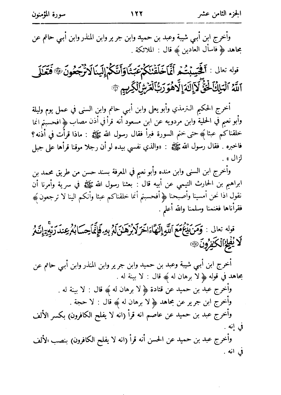 - قَوْله تَعَالَى: أفحسبتم أَنما خَلَقْنَاكُمْ عَبَثا وأنكم إِلَيْنَا لَا ترجعون فتعالى الله الْملك الْحق لَا إِلَه إِلَّا هُوَ رب الْعَرْش الْكَرِيم