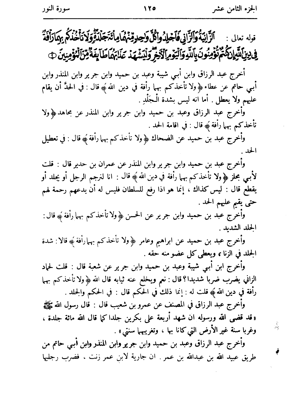 وَأخرج عبد بن حميد وَابْن جرير وَابْن الْمُنْذر عَن عمرَان بن حدير قَالَ: قلت لأبي مجلز {وَلَا تأخذكم بهما رأفة فِي دين الله} قَالَ: انا لنرجم الرجل أَو يجلد أَو يقطع قَالَ: لَيْسَ كَذَاك إِنَّمَا إِذا رفع للسُّلْطَان فَلَيْسَ لَهُ أَن يدعهم رَحْمَة لَهُم حَتَّى يُقيم عَلَيْهِم الْحَد