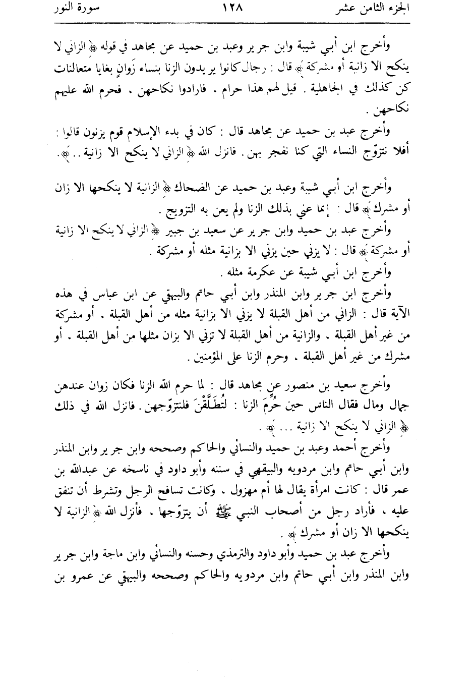 وَأخرج ابْن جرير وَابْن الْمُنْذر وَابْن أبي حَاتِم وَالْبَيْهَقِيّ عَن ابْن عَبَّاس فِي هَذِه الْآيَة قَالَ: الزَّانِي من أهل الْقبْلَة لَا يَزْنِي إِلَّا بزانية مثله من أهل الْقبْلَة أَو مُشركَة من غير أهل الْقبْلَة والزانية من أهل الْقبْلَة لَا تَزني إِلَّا بزان مثلهَا من أهل الْقبْلَة أَو مُشْرك من غير أهل الْقبْلَة وَحرم الزِّنَا على الْمُؤمنِينَ