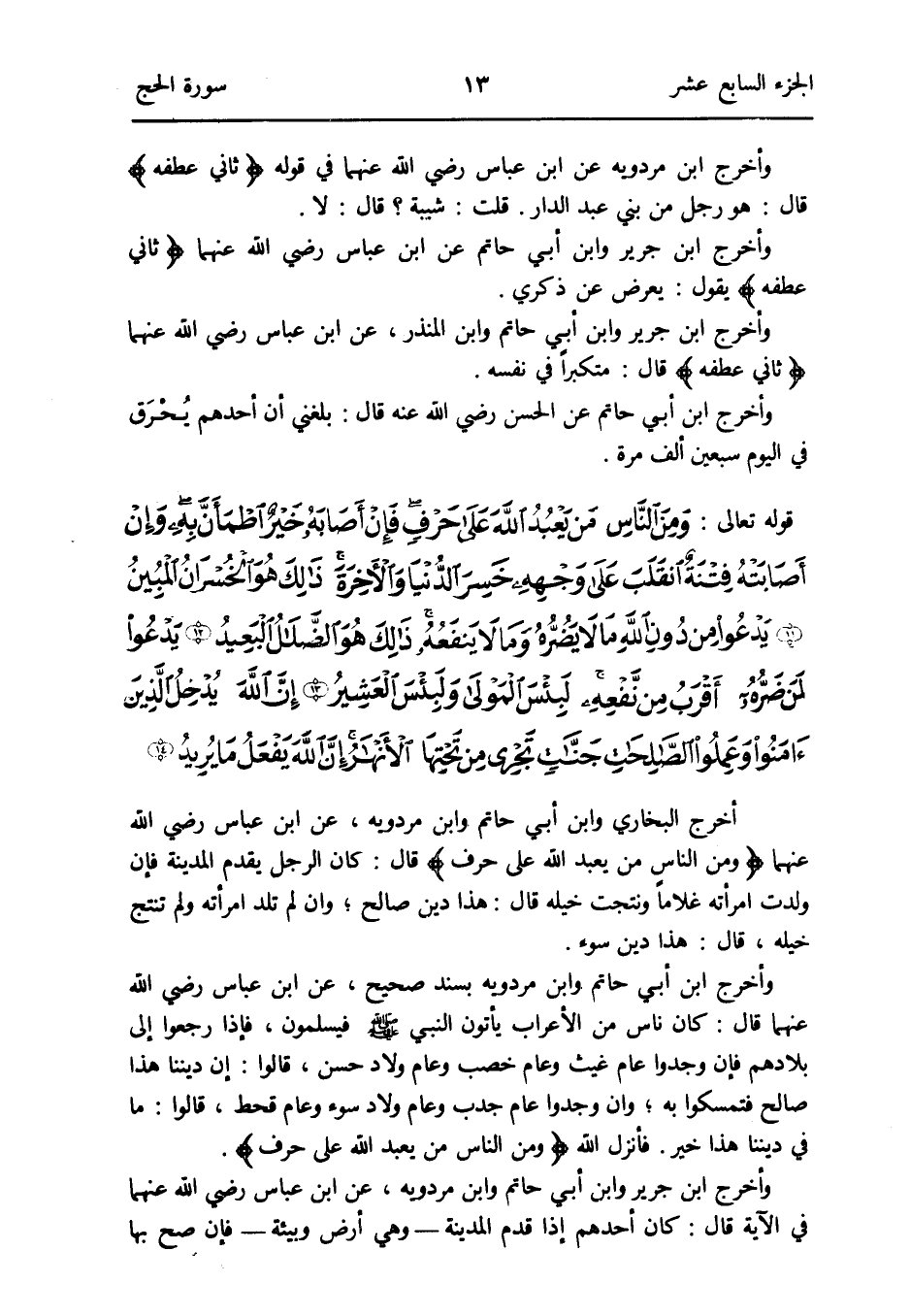 أخرج البُخَارِيّ وَابْن أبي حَاتِم وَابْن مرْدَوَيْه عَن ابْن عَبَّاس رَضِي الله عَنْهُمَا {وَمن النَّاس من يعبد الله على حرف} قَالَ: كَانَ الرجل يقدم الْمَدِينَة فَإِن ولدت امْرَأَته غُلَاما ونتجت خيله قَالَ: هَذَا دين صَالح وَإِن لم تَلد امْرَأَته وَلم تنْتج خيله قَالَ: هَذَا دين سوء