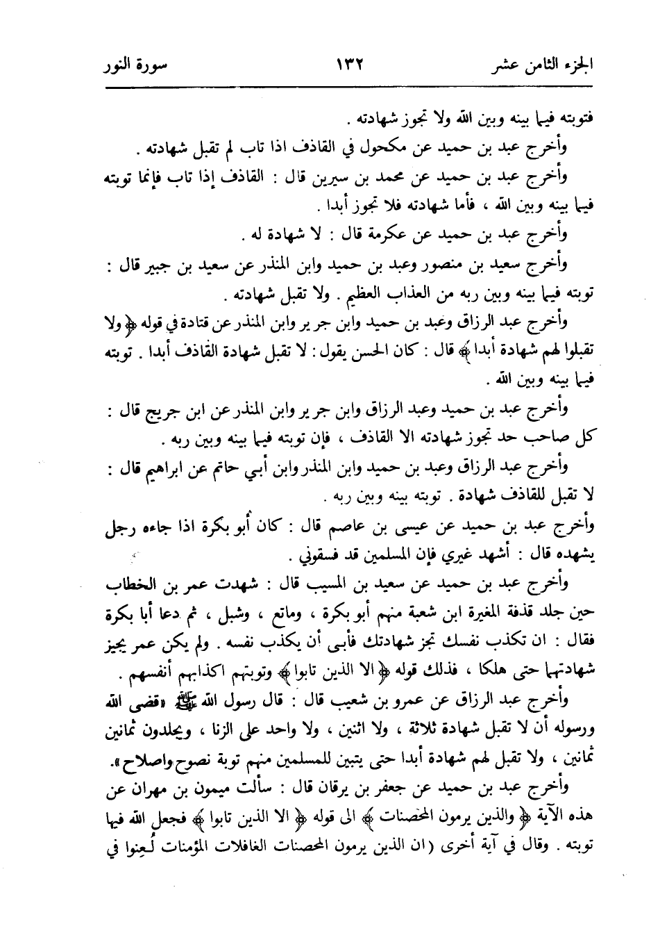 وَأخرج عبد بن حميد وَعبد الرَّزَّاق وَابْن جرير وَابْن الْمُنْذر عَن ابْن جريج قَالَ: كل صَاحب حد تجوز شَهَادَته إِلَّا الْقَاذِف فَإِن تَوْبَته فِيمَا بَينه وَبَين ربه