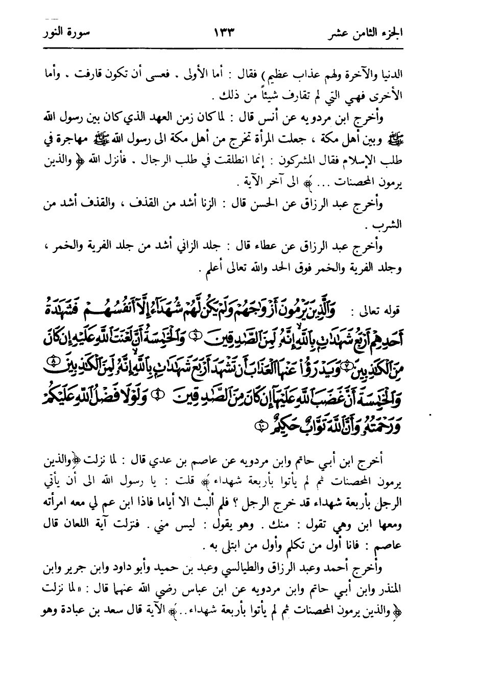 - قَوْله تَعَالَى: وَالَّذين يرْمونَ أَزوَاجهم وَلم يكن لَهُم شُهَدَاء إِلَّا أنفسهم فشهادة أحدهم أَربع شَهَادَات بِاللَّه أَنه لمن الصَّادِقين وَالْخَامِسَة أَن لعنة الله عَلَيْهِ ان كَانَ من الْكَاذِبين ويدرؤا عَنْهَا الْعَذَاب أَن تشهد أَربع شَهَادَات بِاللَّه أَنه لمن الْكَاذِبين وَالْخَامِسَة أَن غضب الله عَلَيْهَا أَن كَانَ من الصَّادِقين وَلَوْلَا فضل الله عَلَيْكُم وَرَحمته وَأَن الله تواب حَكِيم