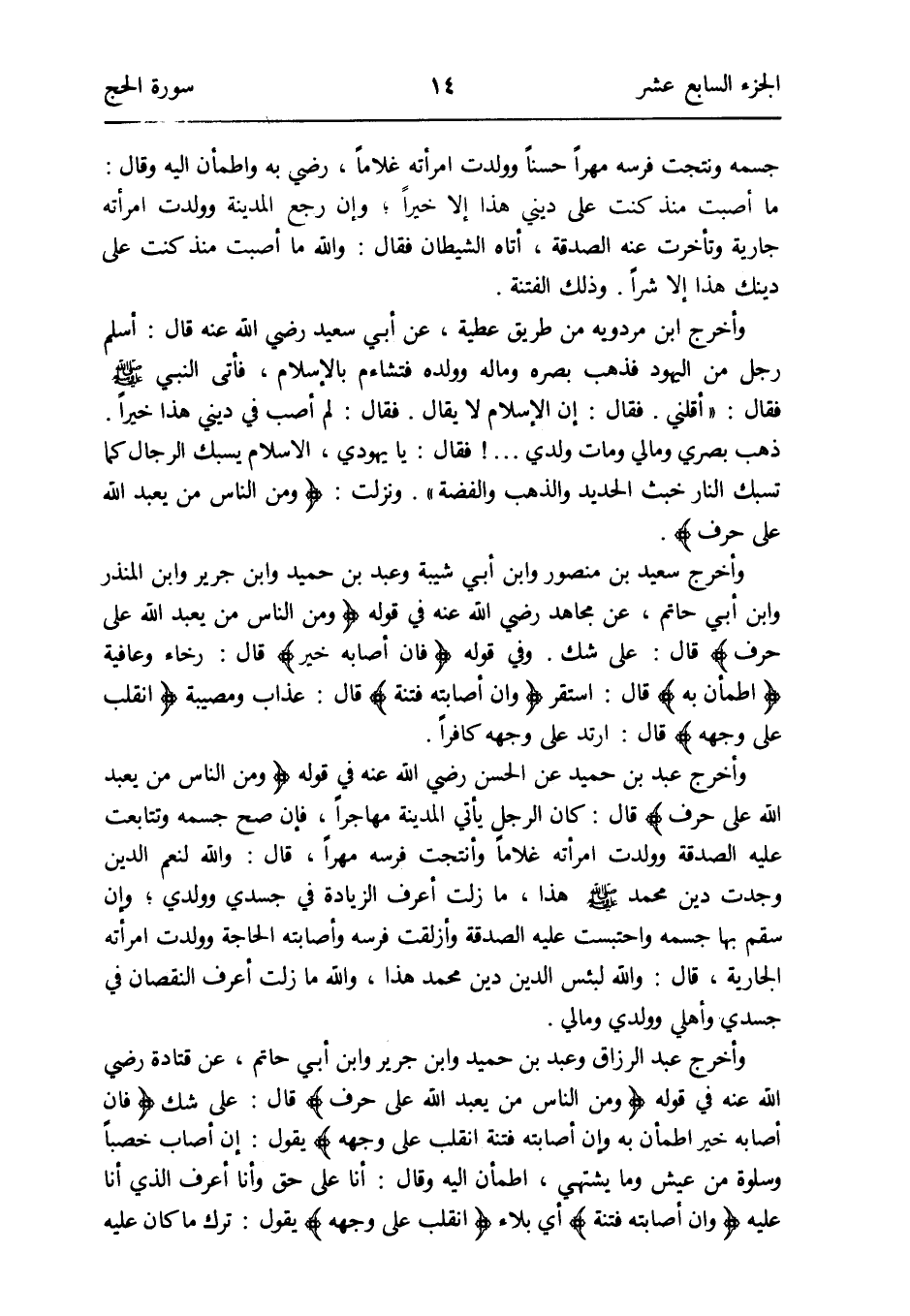 وَأخرج عبد بن حميد عَن الْحسن رَضِي الله عَنهُ فِي قَوْله {وَمن النَّاس من يعبد الله على حرف} قَالَ: كَانَ الرجل يَأْتِي الْمَدِينَة مُهَاجرا فَإِن صَحَّ جِسْمه وَتَتَابَعَتْ عَلَيْهِ الصَّدَقَة وَولدت امْرَأَته غُلَاما وأنتجت فرسه مهْرا قَالَ: وَالله لنعم الدّين وجدت دين مُحَمَّد صلى الله عَلَيْهِ وَسلم هَذَا مَا زلت أعرف الزِّيَادَة فِي جَسَدِي وَوَلَدي وَإِن سقم بهَا جِسْمه واحتبست عَلَيْهِ الصَّدَقَة وأزلقت فرسه وأصابته الْحَاجة وَولدت امْرَأَته الْجَارِيَة قَالَ: وَالله لبئس الدّين دين مُحَمَّد هَذَا وَالله مَا زلت أعرف النُّقْصَان فِي جَسَدِي وَأَهلي وَوَلَدي وَمَالِي