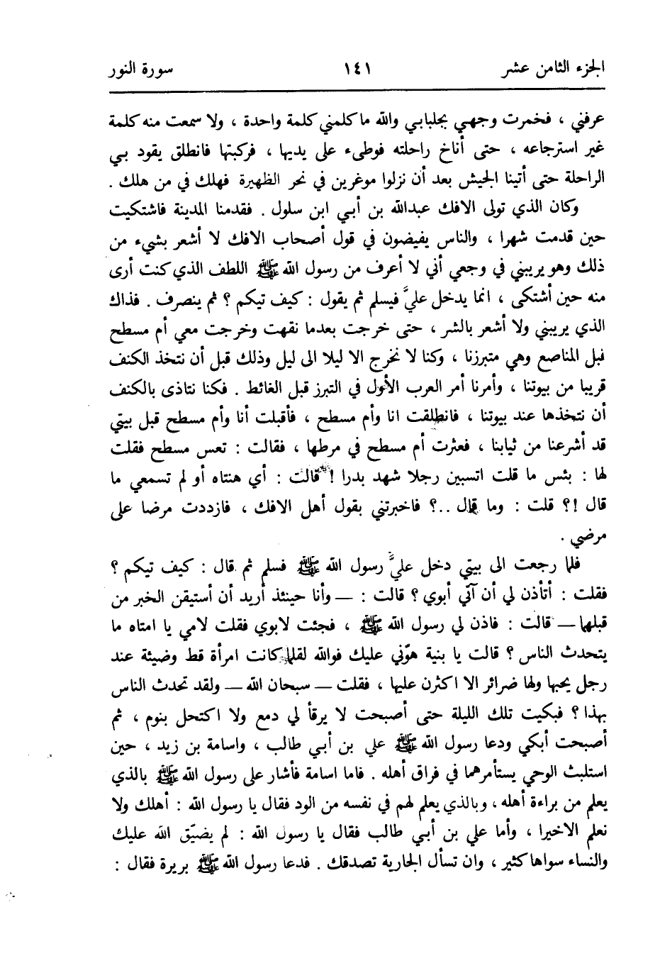 فَلَمَّا رجعت إِلَى بَيْتِي دخل عليَّ رَسُول الله صلى الله عَلَيْهِ وَسلم فَسلم ثمَّ قَالَ: كَيفَ تيكم فَقلت: أتأذن لي أَن آتِي أَبَوي قَالَت: - وَأَنا حِينَئِذٍ أُرِيد أَن أستيقن الْخَبَر من قبلهمَا - قَالَت: فَأذن لي رَسُول الله صلى الله عَلَيْهِ وَسلم فَجئْت لأبوي فَقلت لأمي يَا أمتاه مَا يتحدث النَّاس قَالَت يَا بنية هوني عَلَيْك فو الله لقلما كَانَت امْرَأَة قطّ وضيئة عِنْد رجل يُحِبهَا وَلها ضرائر إِلَّا أكثرن عَلَيْهَا فَقلت - سُبْحَانَ الله - وَلَقَد تحدث النَّاس بِهَذَا فَبَكَيْت تِلْكَ اللَّيْلَة حَتَّى أَصبَحت لَا يرقأ لي دمع وَلَا اكتحل بنوم ثمَّ أَصبَحت أبْكِي ودعا رَسُول الله صلى الله عَلَيْهِ وَسلم عَليّ بن أبي طَالب وَأُسَامَة بن زيد حِين استلبث الْوَحْي يستأمرهما فِي فِرَاق أَهله