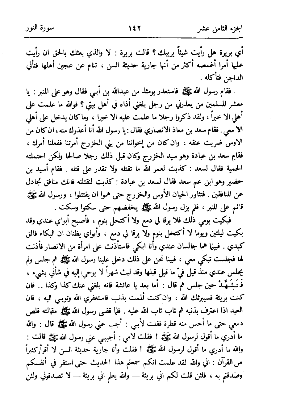 فَقَامَ رَسُول الله صلى الله عَلَيْهِ وَسلم فاستعذر يَوْمئِذٍ من عبد الله بن أبي فَقَالَ وَهُوَ على الْمِنْبَر: يَا معشر الْمُسلمين من يعذرني من رجل بَلغنِي أَذَاهُ فِي أهل بَيْتِي فوَاللَّه مَا علمت على أَهلِي إِلَّا خيرا وَلَقَد ذكرُوا رجلا مَا علمت عَلَيْهِ إِلَّا خيرا وَمَا كَانَ يدْخل على أَهلِي إِلَّا معي