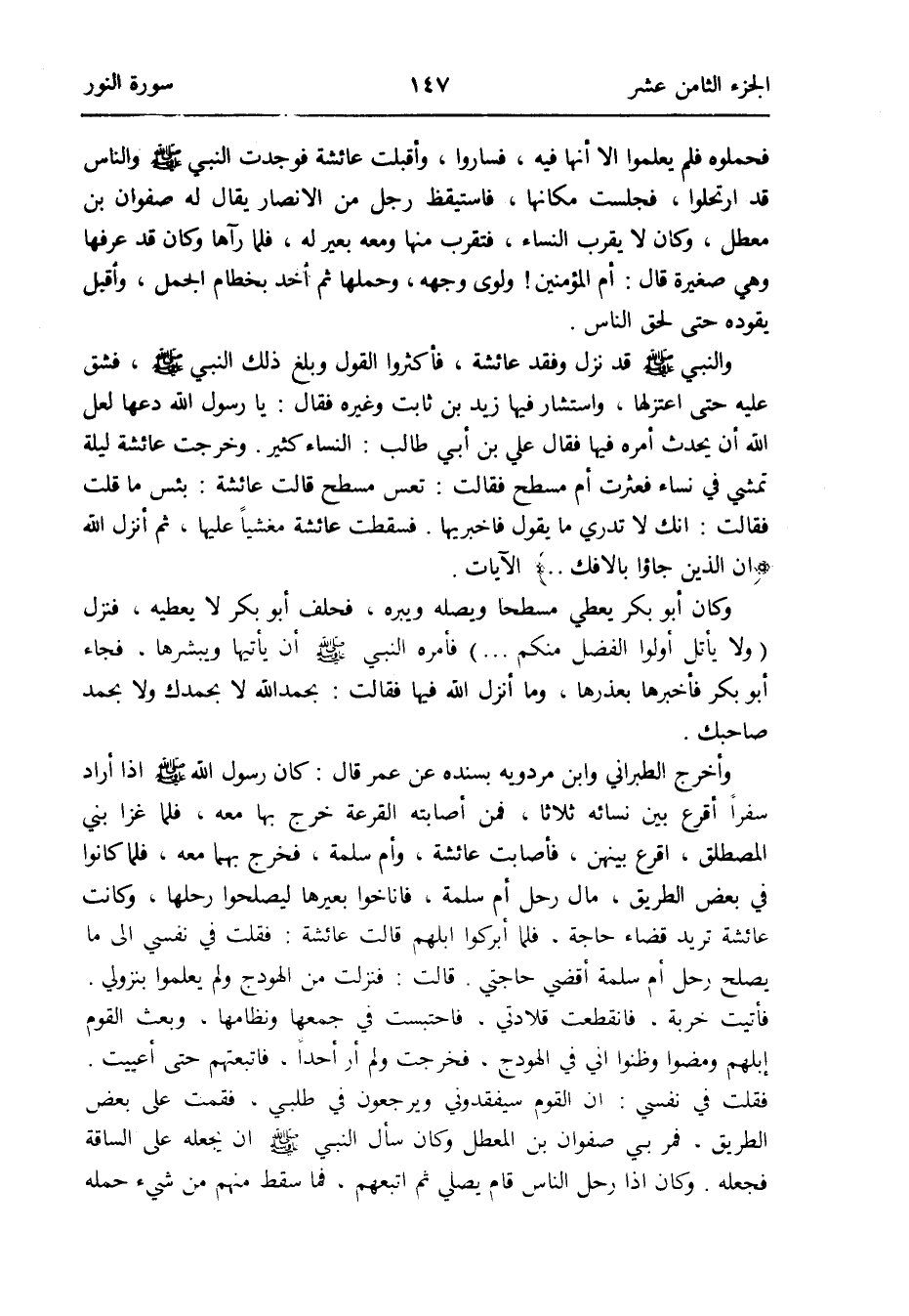 وَأخرج الطَّبَرَانِيّ وَابْن مرْدَوَيْه بِسَنَدِهِ عَن عمر قَالَ: كَانَ رَسُول الله صلى الله عَلَيْهِ وَسلم إِذا اراد سفرا أَقرع بَين نِسَائِهِ ثَلَاثًا فَمن أَصَابَته الْقرعَة خرج بهَا مَعَه فَلَمَّا غزا بني المصطلق أَقرع بَينهُنَّ فأصابت عَائِشَة وَأم سَلمَة فَخرج بهما مَعَه فَلَمَّا كَانُوا فِي بعض الطَّرِيق مَال رَحل أم سَلمَة فأناخوا بَعِيرهَا لِيُصْلِحُوا رَحلهَا وَكَانَت عَائِشَة تُرِيدُ قَضَاء حَاجَة فَلَمَّا أبركوا إبلهم قَالَت عَائِشَة: فَقلت فِي نَفسِي إِلَى مَا يصلح رَحل أم سَلمَة أَقْْضِي حَاجَتي
