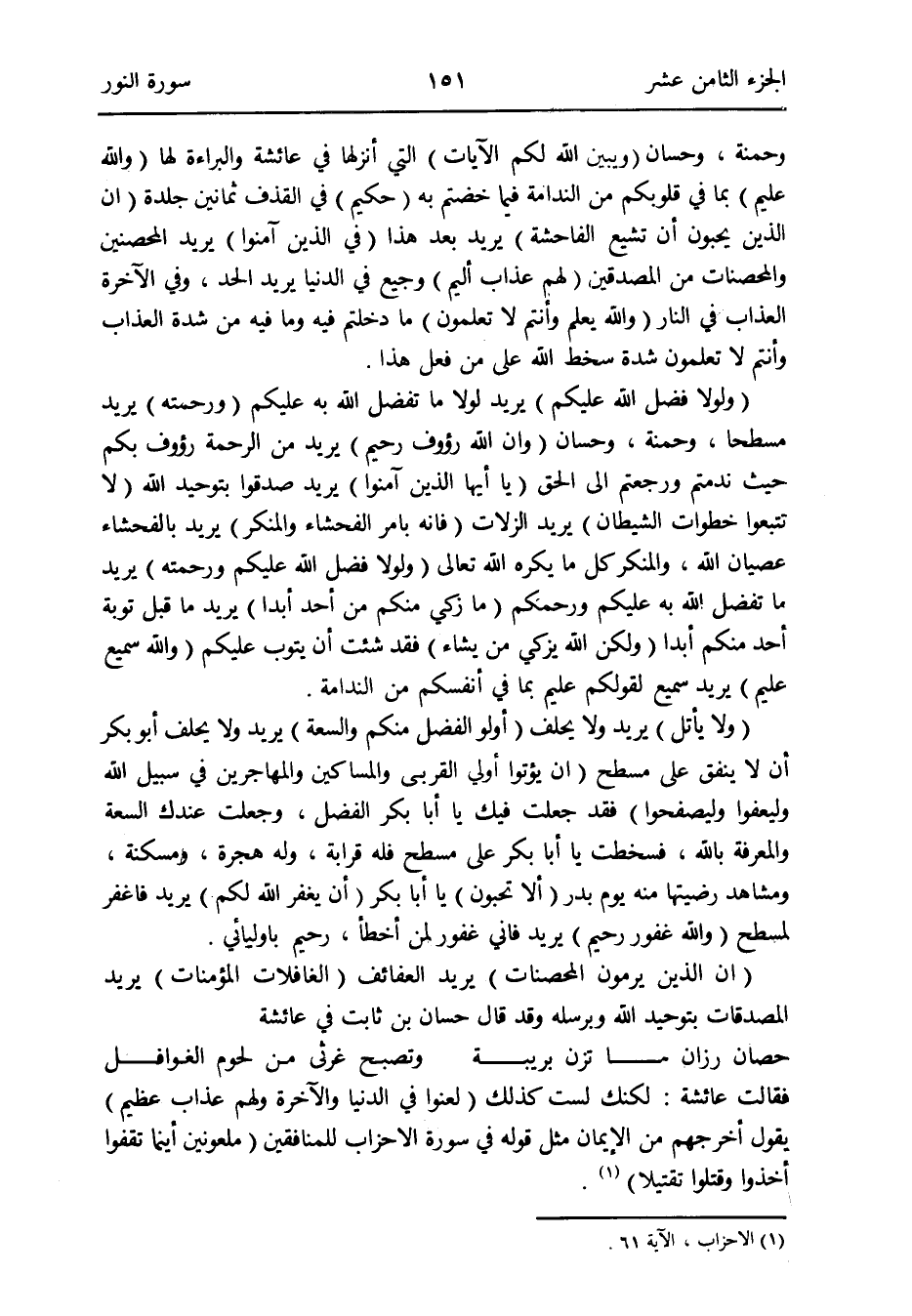 {وَلَوْلَا فضل الله عَلَيْكُم} يُرِيد لَوْلَا مَا تفضل الله بِهِ عَلَيْكُم {وَرَحمته} يُرِيد مسطحًا وَحمْنَة وَحسان {وَإِن الله رؤوف رَحِيم} يُرِيد من الرَّحْمَة رؤوف بكم حَيْثُ ندمتم وَرَجَعْتُمْ إِلَى الْحق {يَا أَيهَا الَّذين آمنُوا} يُرِيد صدقُوا بتوحيد الله {لَا تتبعوا خطوَات الشَّيْطَان} يُرِيد الزلات {فَإِنَّهُ يَأْمر بالفحشاء وَالْمُنكر} يُرِيد بالفحشاء عصيان الله وَالْمُنكر كل مَا يكره الله تَعَالَى {وَلَوْلَا فضل الله عَلَيْكُم وَرَحمته} يُرِيد مَا تفضل الله بِهِ عَلَيْكُم وَرَحِمَكُمْ {مَا زكا مِنْكُم من أحد أبدا} يُرِيد مَا قبل تَوْبَة أحد مِنْكُم أبدا {وَلَكِن الله يُزكي من يَشَاء} فقد شِئْت أَن يَتُوب عَلَيْكُم {وَالله سميع عليم} يُرِيد سميع لقولكم عليم بِمَا فِي أَنفسكُم من الندامة