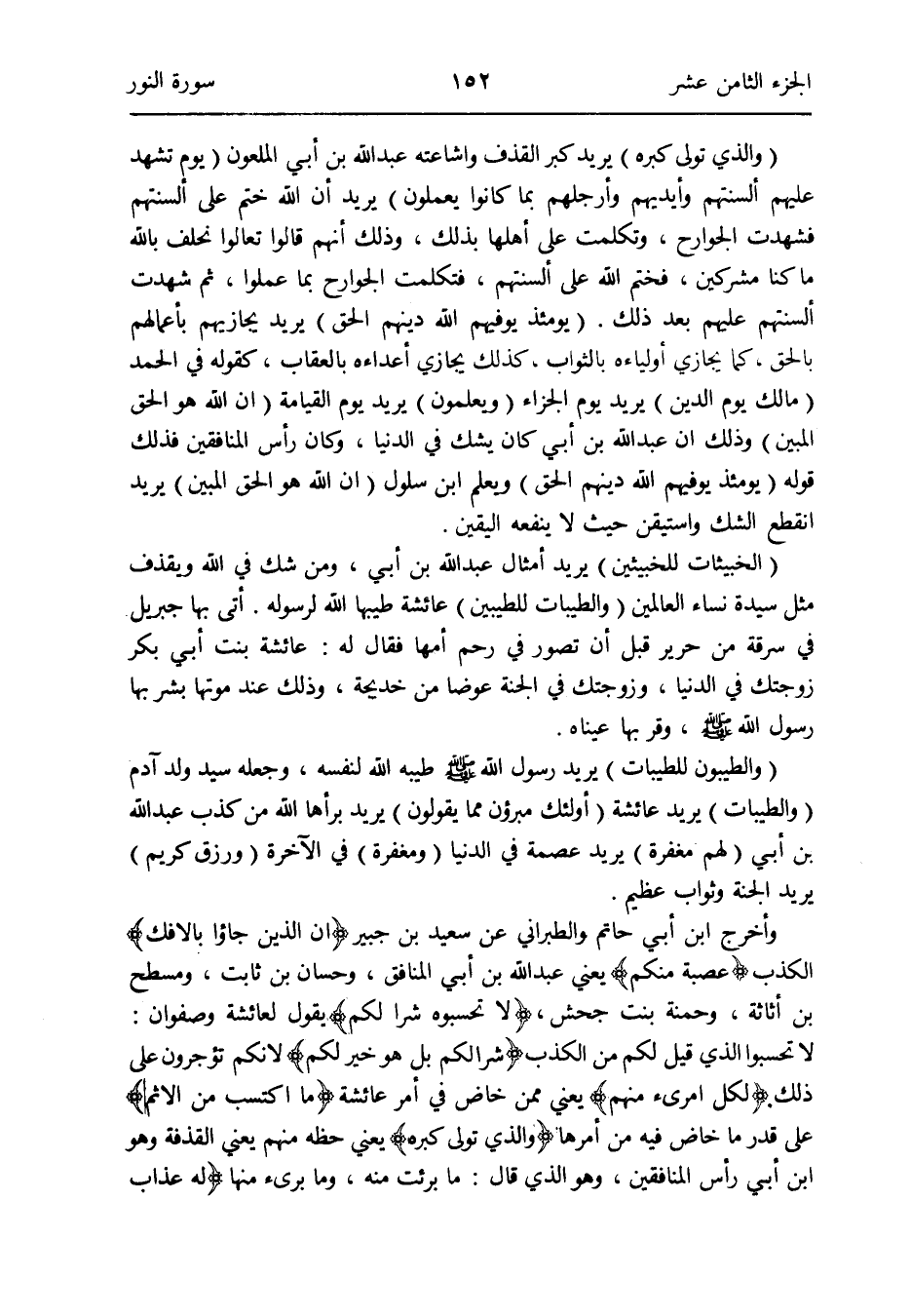 وَأخرج ابْن أبي حَاتِم وَالطَّبَرَانِيّ عَن سعيد بن جُبَير {أَن الَّذين جاؤوا بالإِفك} الْكَذِب {عصبَة مِنْكُم} يَعْنِي عبد الله بن أبي الْمُنَافِق وَحسان بن ثَابت ومسطح بن أَثَاثَة وَحمْنَة بنت جحش {لَا تحسبوه شرا لكم} يَقُول لعَائِشَة وَصَفوَان: لَا تحسبوا الَّذِي قيل لكم من الْكَذِب {شرا لكم بل هُوَ خير لكم} لأنكم تؤجرون على ذَلِك {لكل امْرِئ مِنْهُم} يَعْنِي مِمَّن خَاضَ فِي أَمر عَائِشَة {مَا اكْتسب من الإِثم} على قدر مَا خَاضَ فِيهِ من أمرهَا {وَالَّذِي تولى كبره} يَعْنِي حَظه مِنْهُم يَعْنِي القدفة وَهُوَ ابْن أبي رَأس الْمُنَافِقين وَهُوَ الَّذِي قَالَ: مَا بَرِئت مِنْهُ وَمَا برىء مِنْهَا {لَهُ عَذَاب عَظِيم}