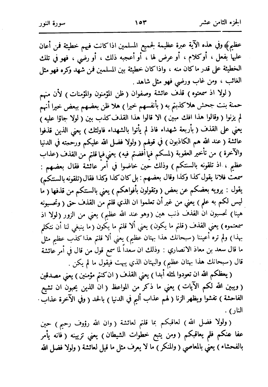 {لَوْلَا إِذْ سمعتموه} قذف عَائِشَة وَصَفوَان {ظن الْمُؤْمِنُونَ وَالْمُؤْمِنَات} لِأَن مِنْهُم حمْنَة بنت جحش هلا كَذبْتُمْ بِهِ {بِأَنْفسِهِم خيرا} هلا ظن بَعضهم بِبَعْض خيرا أَنهم لم يزنوا {وَقَالُوا هَذَا إِِفك مُبين} الا قَالُوا هَذَا الْقَذْف كذب بَين {لَوْلَا جاؤوا عَلَيْهِ} يَعْنِي على الْقَذْف {بأَرْبعَة شُهَدَاء فَإذْ لم يَأْتُوا بِالشُّهَدَاءِ فَأُولَئِك} يَعْنِي الَّذِي قذفوا عَائِشَة {عِنْد الله هم الْكَاذِبُونَ} فِي قَوْلهم {وَلَوْلَا فضل الله عَلَيْكُم وَرَحمته فِي الدُّنْيَا وَالْآخِرَة} من تَأْخِير الْعقُوبَة {لمسكم فِيمَا أَفَضْتُم فِيهِ} يَعْنِي فِيمَا قُلْتُمْ من الْقَذْف {عَذَاب عَظِيم إِذْ تلقونه بألسنتكم} وَذَلِكَ حِين خَاضُوا فِي أَمر عَائِشَة فَقَالَ بَعضهم: سَمِعت فلَانا يَقُول كَذَا وَكَذَا وَقَالَ بَعضهم: بل كَانَ كَذَا وَكَذَا فَقَالَ {تلقونه بألسنتكم} يَقُول: يرويهِ بَعْضكُم عَن بعض {وتقولون بأفواهكم} يَعْنِي بألسنتكم من قَذفهَا {مَا لَيْسَ لكم بِهِ علم} يَعْنِي من غير أَن تعلمُوا أَن الَّذِي قُلْتُمْ من الْقَذْف حق {وتحسبونه هيناً} تحسبون أَن الْقَذْف ذَنْب هَين {وَهُوَ عِنْد الله عَظِيم} يَعْنِي من الزُّور {لَوْلَا إِذْ سمعتموه} يَعْنِي الْقَذْف {قُلْتُمْ مَا يكون} يَعْنِي أَلا قُلْتُمْ مَا يكون {مَا يكون لنا أَن نتكلم بِهَذَا} وَلم تره أَعيننَا {سُبْحَانَكَ هَذَا بهتان عَظِيم} يَعْنِي أَلا قُلْتُمْ هَذَا كذب عَظِيم مثل مَا قَالَ سعد بن معَاذ الْأنْصَارِيّ: وَذَلِكَ أَن سَعْدا لما سمع قَول من قَالَ فِي أَمر عَائِشَة قَالَ {سُبْحَانَكَ هَذَا بهتان عَظِيم} يَعْنِي أَلا قُلْتُمْ هَذَا كذب عَظِيم مثل مَا قَالَ سعد بن معَاذ الْأنْصَارِيّ: وَذَلِكَ أَن سَعْدا لما سمع قَول من قَالَ فِي أَمر عَائِشَة قَالَ {سُبْحَانَكَ هَذَا بهتان عَظِيم} والبهتان الَّذِي يبهت فَيَقُول مَا لم يكن