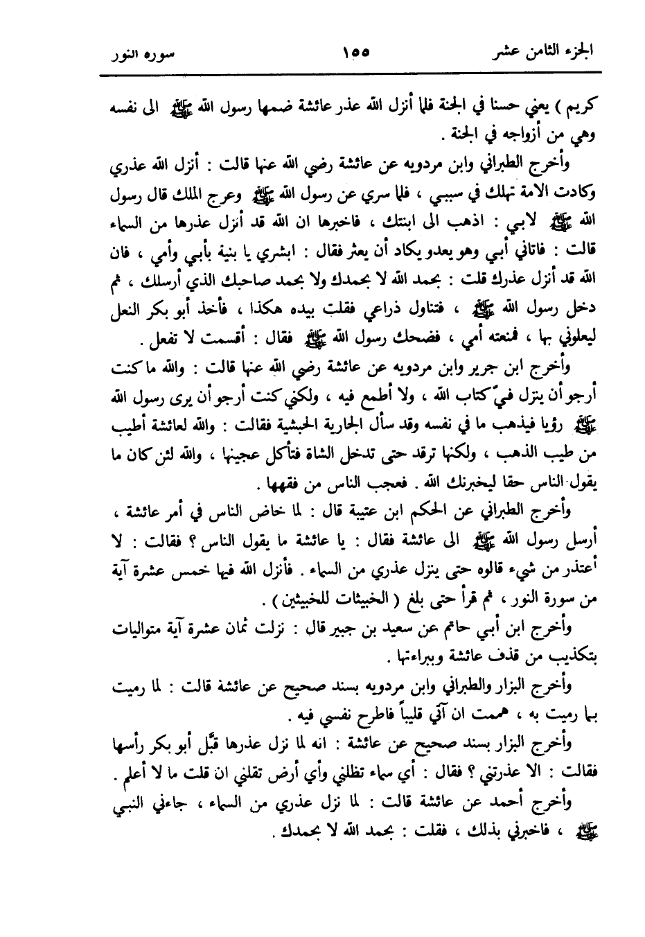 وَأخرج الطَّبَرَانِيّ وَابْن مرْدَوَيْه عَن عَائِشَة رَضِي الله عَنْهَا قَالَت: أنزل الله عُذْري وكادت الْأمة تهْلك فِي سببي فَلَمَّا سري عَن رَسُول الله صلى الله عَلَيْهِ وَسلم وعرج الْملك قَالَ رَسُول الله صلى الله عَلَيْهِ وَسلم لأَبِيك اذْهَبْ إِلَى ابْنَتك فاخبرها أَن الله قد أنزل عذرها من السَّمَاء قَالَت: فَأَتَانِي أبي وَهُوَ يعدو يكَاد أَن يعثر فَقَالَ: ابشري يَا بنية بِأبي وَأمي فَإِن الله قد أنزل عذرك قلت: بِحَمْد الله لَا بحَمْدك وَلَا بِحَمْد صَاحبك الَّذِي أرسلك ثمَّ دخل رَسُول الله صلى الله عَلَيْهِ وَسلم فَتَنَاول ذراعي فَقلت بِيَدِهِ هَكَذَا فَأخذ أَبُو بكر النَّعْل ليعلوني بهَا فمنعته أُمِّي فَضَحِك رَسُول الله صلى الله عَلَيْهِ وَسلم فَقَالَ: أَقْسَمت لَا تفعل