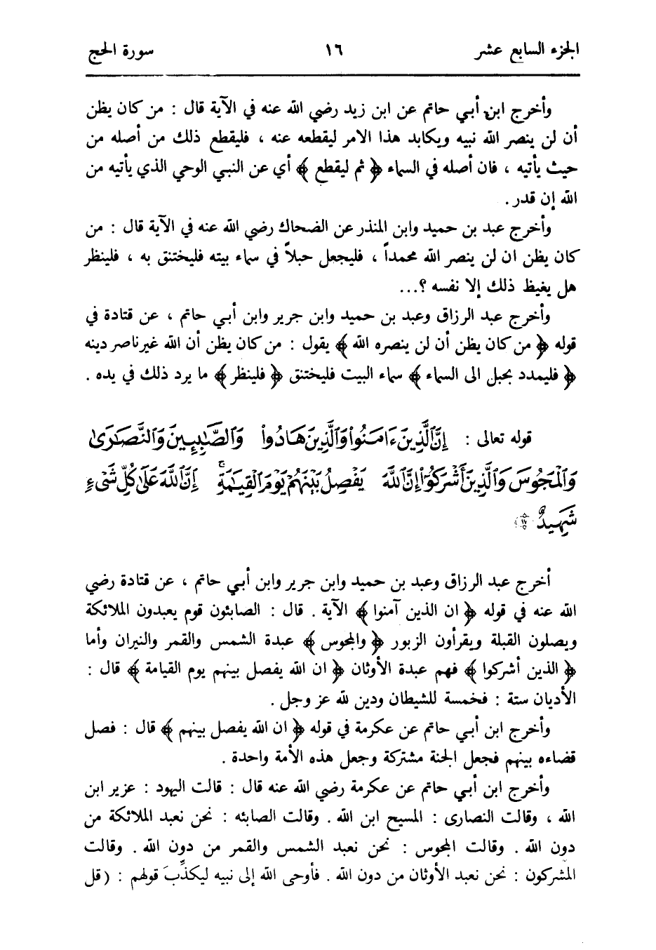 وَأخرج عبد الرَّزَّاق وَعبد بن حميد وَابْن جرير وَابْن أبي حَاتِم عَن قَتَادَة فِي قَوْله {من كَانَ يظنّ أَن لن ينصره الله} يَقُول: من كَانَ يظنّ أَن الله غير نَاصِر دينه {فليمدد بِسَبَب إِلَى السَّمَاء} سَمَاء الْبَيْت فليختنق {فَلْينْظر} مَا يرد ذَلِك فِي يَده