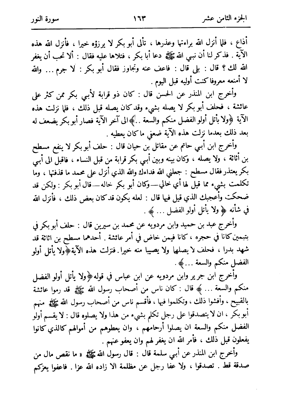 وَأخرج ابْن جرير وَابْن مرْدَوَيْه عَن ابْن عَبَّاس فِي قَوْله {وَلَا يَأْتَلِ أولُوا الْفضل مِنْكُم وَالسعَة} قَالَ: كَانَ نَاس من أَصْحَاب رَسُول الله صلى الله عَلَيْهِ وَسلم قد رموا عَائِشَة بالقبيح وأفشوا ذَلِك وَتَكَلَّمُوا فِيهَا فأقسم نَاس من أَصْحَاب رَسُول الله صلى الله عَلَيْهِ وَسلم مِنْهُم أَبُو بكر أَن لَا يتصدقوا على رجل تكلم بِشَيْء من هَذَا وَلَا يصلوه قَالَ: لَا يقسم أولُوا الْفضل مِنْكُم وَالسعَة أَن يصلوا أرحامهم وَأَن يعطوهم من أَمْوَالهم كَالَّذي كَانُوا يَفْعَلُونَ قبل ذَلِك فَأمر الله أَن يغْفر لَهُم وَأَن يعْفُو عَنْهُم