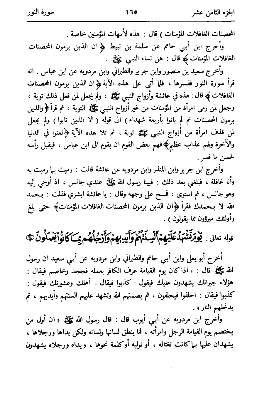 أَنه قَرَأَ سُورَة النُّور فَفَسَّرَهَا فَلَمَّا أَتَى على هَذِه الْآيَة {إِن الَّذين يرْمونَ الْمُحْصنَات الْغَافِلَات} قَالَ: هَذِه فِي عَائِشَة وَأَزْوَاج النَّبِي صلى الله عَلَيْهِ وَسلم وَلم يَجْعَل لمن فعل ذَلِك تَوْبَة وَجعل لمن رمى امْرَأَة من الْمُؤْمِنَات من غير أَزوَاج النَّبِي صلى الله عَلَيْهِ وَسلم التَّوْبَة ثمَّ قَرَأَ {وَالَّذين يرْمونَ الْمُحْصنَات ثمَّ لم يَأْتُوا بأَرْبعَة شُهَدَاء} إِلَى قَوْله {إِلَّا الَّذين تَابُوا} وَلم يَجْعَل لمن قذف امْرَأَة من أَزوَاج النَّبِي صلى الله عَلَيْهِ وَسلم تَوْبَة ثمَّ تَلا هَذِه الْآيَة {لعنُوا فِي الدُّنْيَا وَالْآخِرَة وَلَهُم عَذَاب عَظِيم} فهم بعض الْقَوْم أَن يقوم إِلَى ابْن عَبَّاس فَيقبل رَأسه لحسن مَا فسر