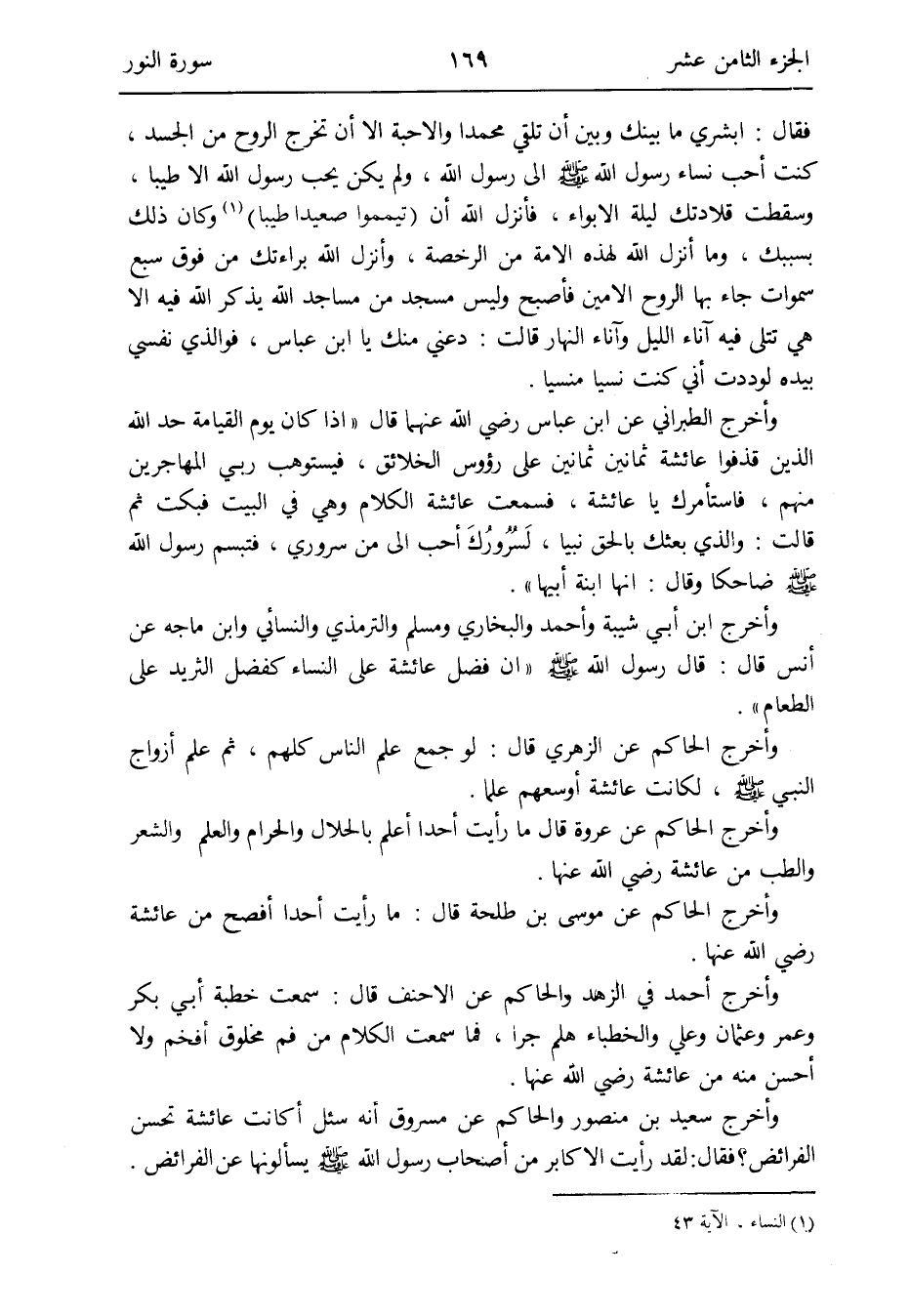 وَأخرج الطَّبَرَانِيّ عَن ابْن عَبَّاس رَضِي الله عَنْهُمَا قَالَ إِذا كَانَ يَوْم الْقِيَامَة حد الله الَّذين قذفوا عَائِشَة ثَمَانِينَ ثَمَانِينَ على رُؤُوس الْخَلَائق فيستوهب رَبِّي الْمُهَاجِرين مِنْهُم فاستأمرك يَا عَائِشَة فَسمِعت عَائِشَة الْكَلَام وَهِي فِي الْبَيْت فَبَكَتْ ثمَّ قَالَت: وَالَّذِي بَعثك بِالْحَقِّ نَبيا لَسُرُورُكَ أحب إليّ من سروري فَتَبَسَّمَ رَسُول الله صلى الله عَلَيْهِ وَسلم ضَاحِكا وَقَالَ: إِنَّهَا ابْنة أَبِيهَا