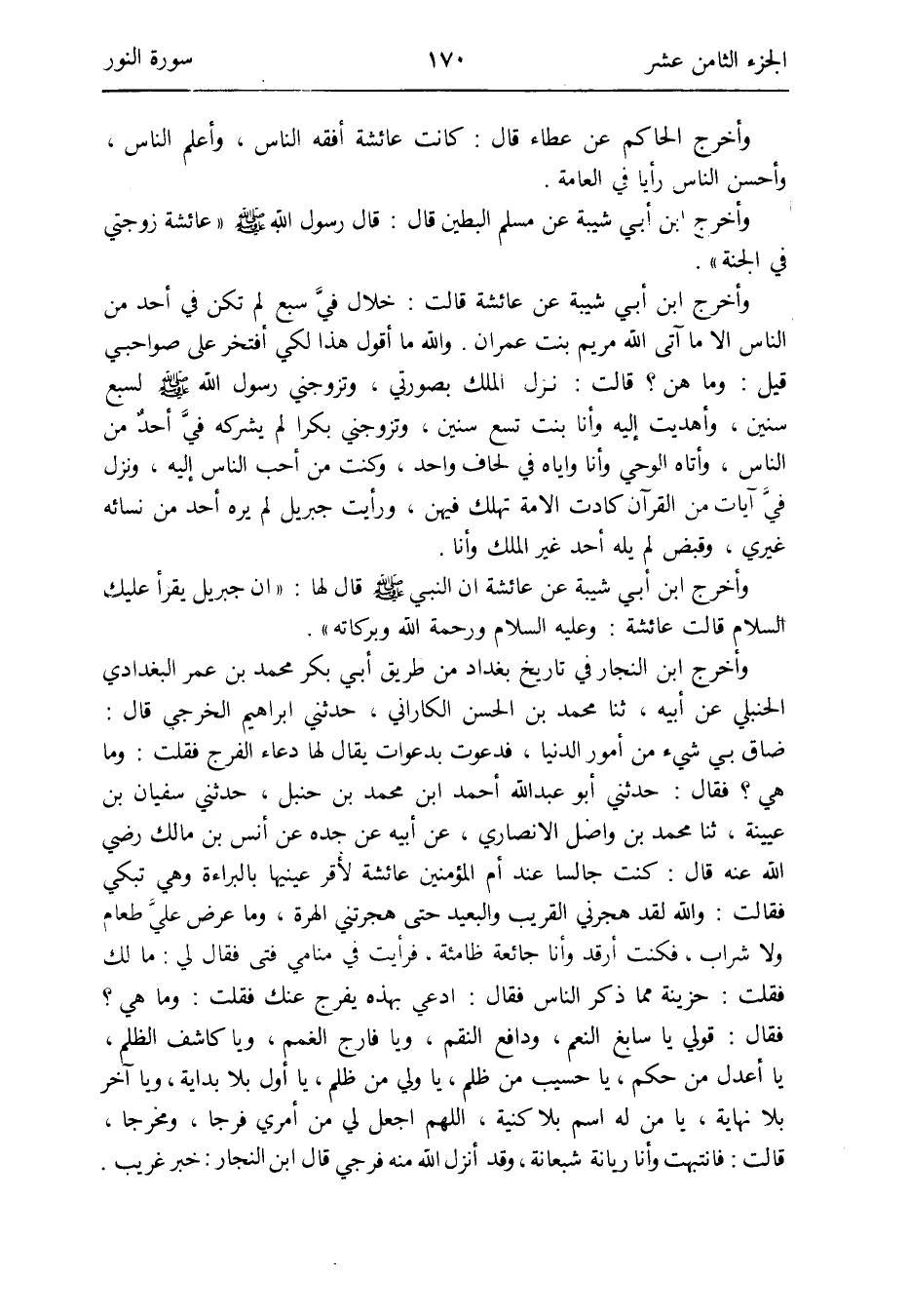 وَأخرج ابْن النجار فِي تَارِيخ بَغْدَاد من طَرِيق أبي بكر مُحَمَّد بن عمر الْبَغْدَادِيّ الْحَنْبَلِيّ عَن أَبِيه ثَنَا مُحَمَّد بن الْحسن الكاراني حَدثنِي إِبْرَاهِيم الخرجي قَالَ: ضَاقَ بِي شَيْء من أُمُور الدُّنْيَا فدعوت بدعوات يُقَال لَهَا دُعَاء الْفرج فَقلت: وَمَا هِيَ فَقَالَ: حَدثنِي أَبُو عبد الله أَحْمد ابْن مُحَمَّد بن حَنْبَل حَدثنِي سُفْيَان بن عُيَيْنَة ثَنَا مُحَمَّد بن وَاصل الْأنْصَارِيّ عَن أَبِيه عَن جده عَن أنس بن مَالك رَضِي الله عَنهُ قَالَ: كنت جَالِسا عِنْد أم الْمُؤمنِينَ عَائِشَة لأقر عينيها بِالْبَرَاءَةِ وَهِي تبْكي فَقَالَت: وَالله لقد هجرني الْقَرِيب والبعيد حَتَّى هجرتني الْهِرَّة وَمَا عرض عليَّ طَعَام وَلَا شراب فَكنت أرقد وَأَنا جائعة ظامئة فَرَأَيْت فِي مَنَامِي فَتى فَقَالَ لي: مَا لَك فَقلت: حزينة مِمَّا ذكر النَّاس فَقَالَ: ادعِي بِهَذِهِ يفرج عَنْك فَقلت: وَمَا هِيَ فَقَالَ: قولي يَا سابغ النعم ودافع النقم وَيَا فارج الغمم وَيَا كاشف الظُّلم يَا أعدل من حكم يَا حسيب من ظلم يَا ولي من ظلم يَا أول بِلَا بداية وَيَا آخر بِلَا نِهَايَة يَا من لَهُ اسْم بِلَا كنية اللَّهُمَّ اجْعَل لي من أَمْرِي فرجا ومخرجاً قَالَت: فانتبهت وَأَنا ريانة شبعانة وَقد أنزل الله مِنْهُ فَرجي قَالَ ابْن النجار: خبر غَرِيب