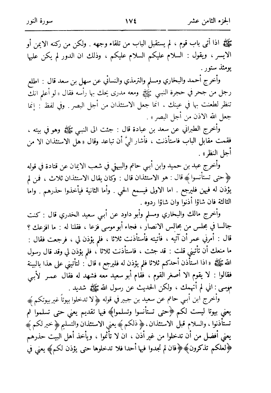 وَأخرج ابْن أبي حَاتِم عَن سعيد بن جُبَير فِي قَوْله {لَا تدْخلُوا بُيُوتًا غير بُيُوتكُمْ} يَعْنِي بُيُوتًا لَيست لكم {حَتَّى تستأنسوا وتسلموا} فِيهَا تَقْدِيم يَعْنِي حَتَّى تسلموا ثمَّ تستأذنوا وَالسَّلَام قبل الاسْتِئْذَان {ذَلِكُم} يَعْنِي الاسْتِئْذَان وَالتَّسْلِيم {خير لكم} يَعْنِي أفضل من أَن تدخل من غير إِذن ان لَا تأثموا وَيَأْخُذ أهل الْبَيْت حذرهم {لَعَلَّكُمْ تذكرُونَ} {فَإِن لم تَجدوا فِيهَا أحدا فَلَا تدخلوها حَتَّى يُؤذن لكم} يَعْنِي فِي