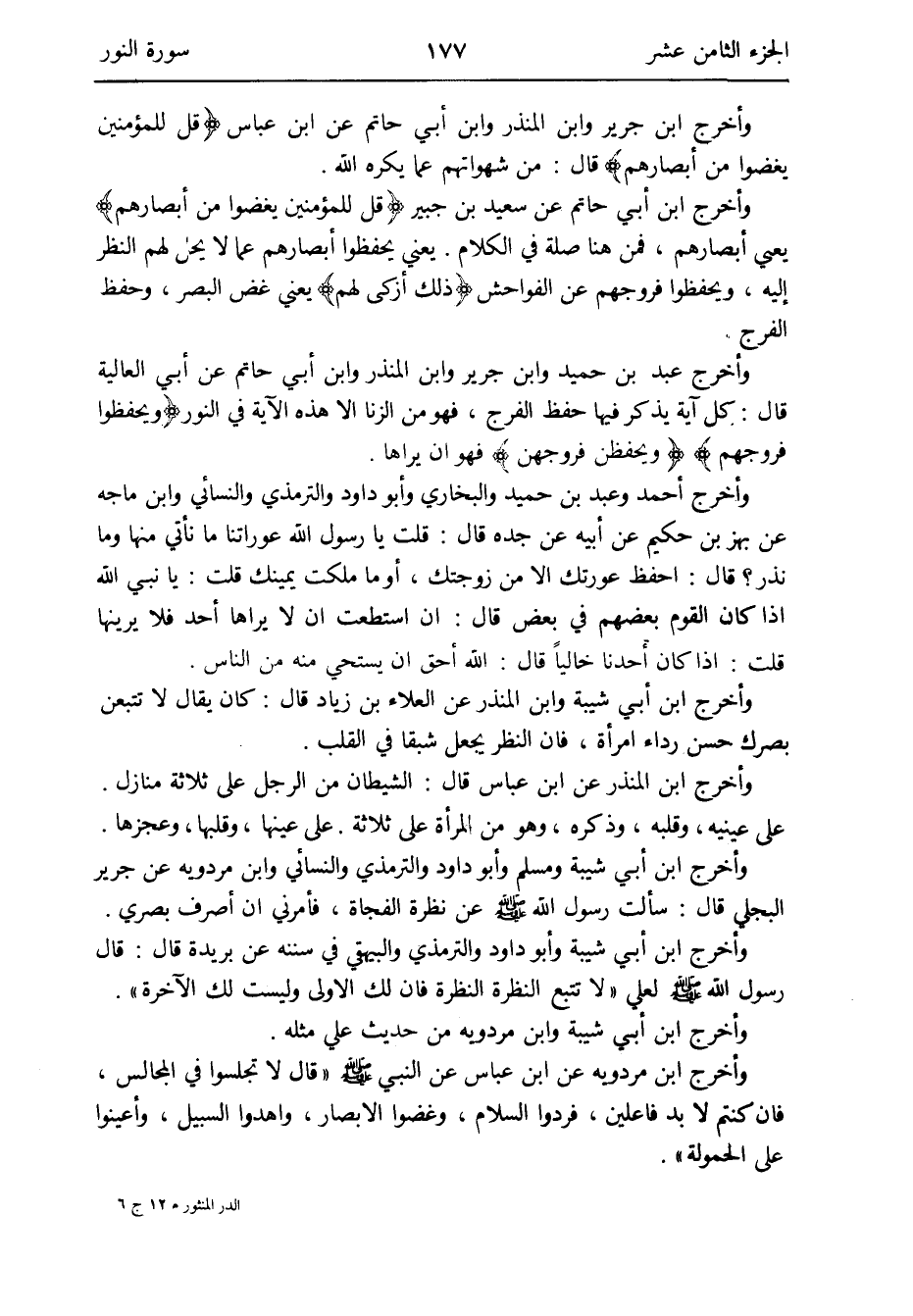 وَأخرج ابْن أبي شيبَة وَمُسلم وَأَبُو دَاوُد وَالتِّرْمِذِيّ وَالنَّسَائِيّ وَابْن مرْدَوَيْه عَن جرير البَجلِيّ قَالَ: سَأَلت رَسُول الله صلى الله عَلَيْهِ وَسلم عَن نظرة الفجاة فَأمرنِي أَن أصرف بَصرِي