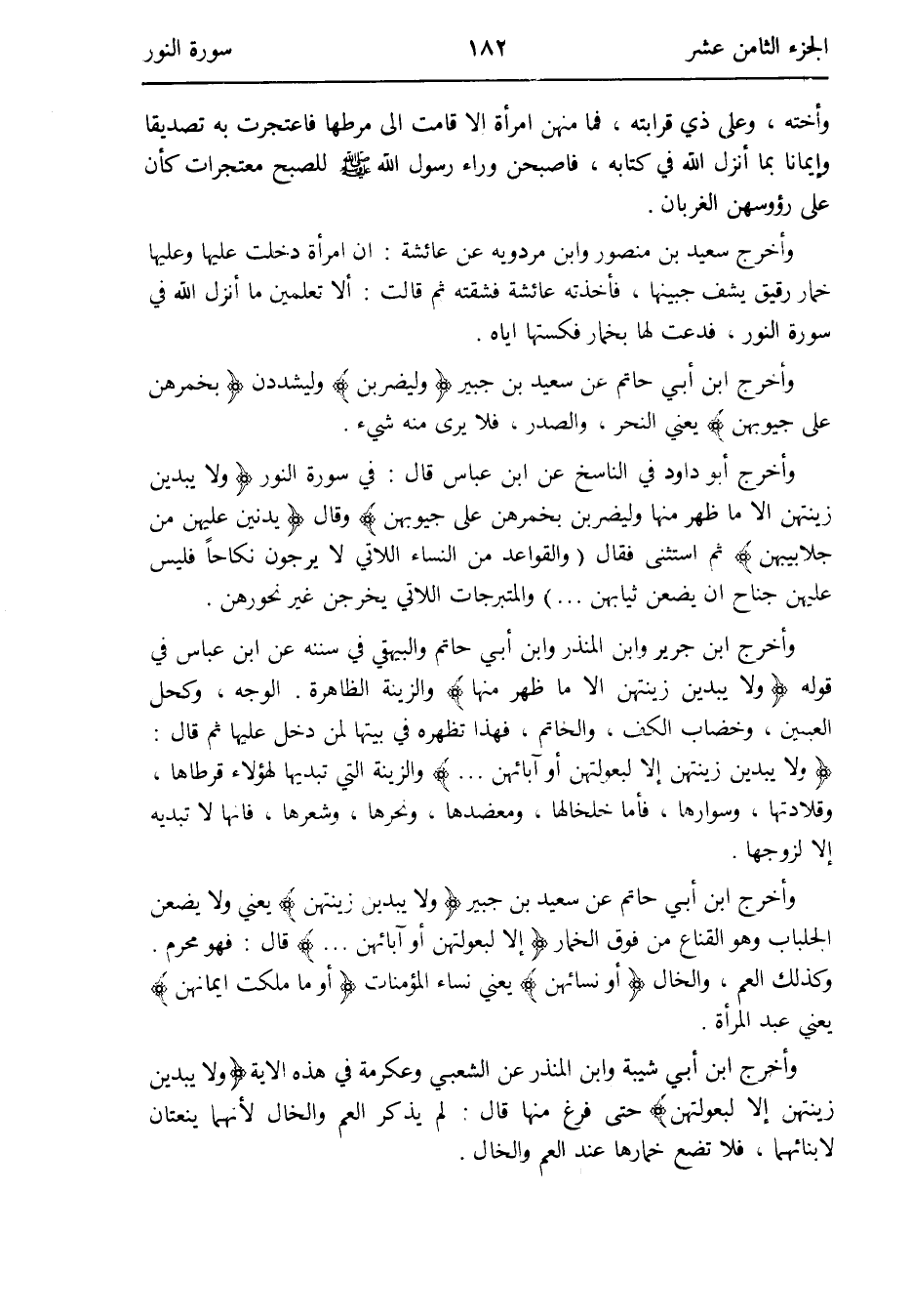 وَأخرج أَبُو دَاوُد فِي النَّاسِخ عَن ابْن عَبَّاس قَالَ: فِي سُورَة النُّور {وَلَا يبدين زينتهن إِلَّا مَا ظهر مِنْهَا وَليَضْرِبن بِخُمُرِهِنَّ على جُيُوبهنَّ} وَقَالَ {يدنين عَلَيْهِنَّ من جلابيبهن} ثمَّ اسْتثْنى فَقَالَ {وَالْقَوَاعِد من النِّسَاء اللَّاتِي لَا يرجون نِكَاحا فَلَيْسَ عَلَيْهِنَّ جنَاح أَن يَضعن ثيابهن} والمتبرجات اللَّاتِي يخْرجن غير نحورهن