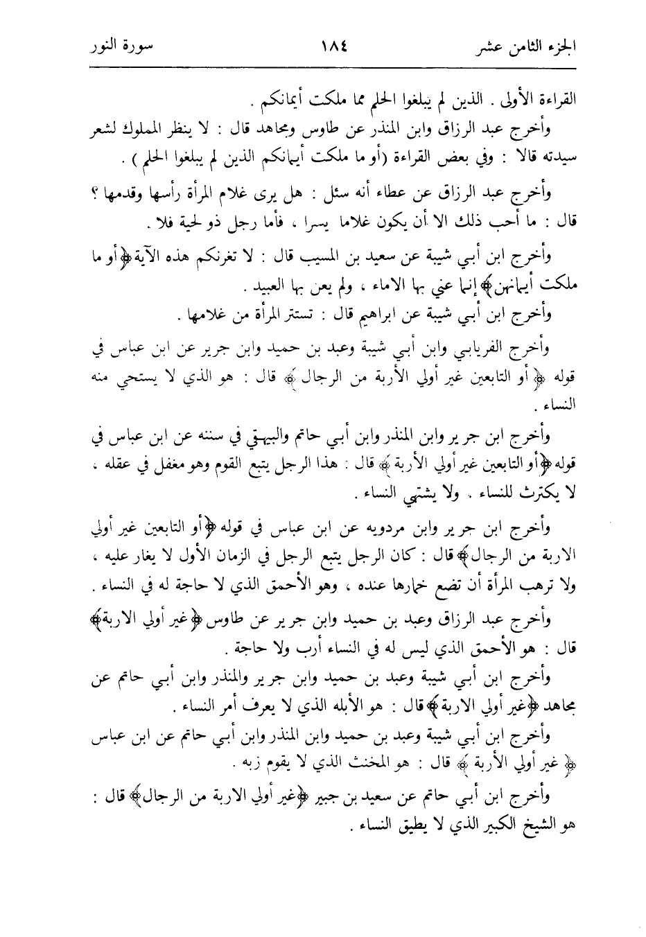 وَأخرج ابْن جرير وَابْن مرْدَوَيْه عَن ابْن عَبَّاس فِي قَوْله {أَو التَّابِعين غير أولي الإِربة من الرِّجَال} قَالَ كَانَ الرجل يتبع الرجل فِي الزَّمَان الأول لَا يغار عَلَيْهِ وَلَا ترهب الْمَرْأَة أَن تضع خمارها عِنْده وَهُوَ الأحمق الَّذِي لَا حَاجَة لَهُ فِي النِّسَاء