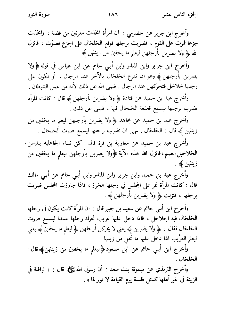 وَأخرج عبد بن حميد وَابْن جرير وَابْن الْمُنْذر وَابْن أبي حَاتِم عَن أبي مَالك قَالَ: كَانَت المراة تمر على الْمجْلس فِي رجلهَا الخرز فَإِذا جَاوَزت الْمجْلس ضربت برجلها فَنزلت {وَلَا يضربن بأرجلهن}
