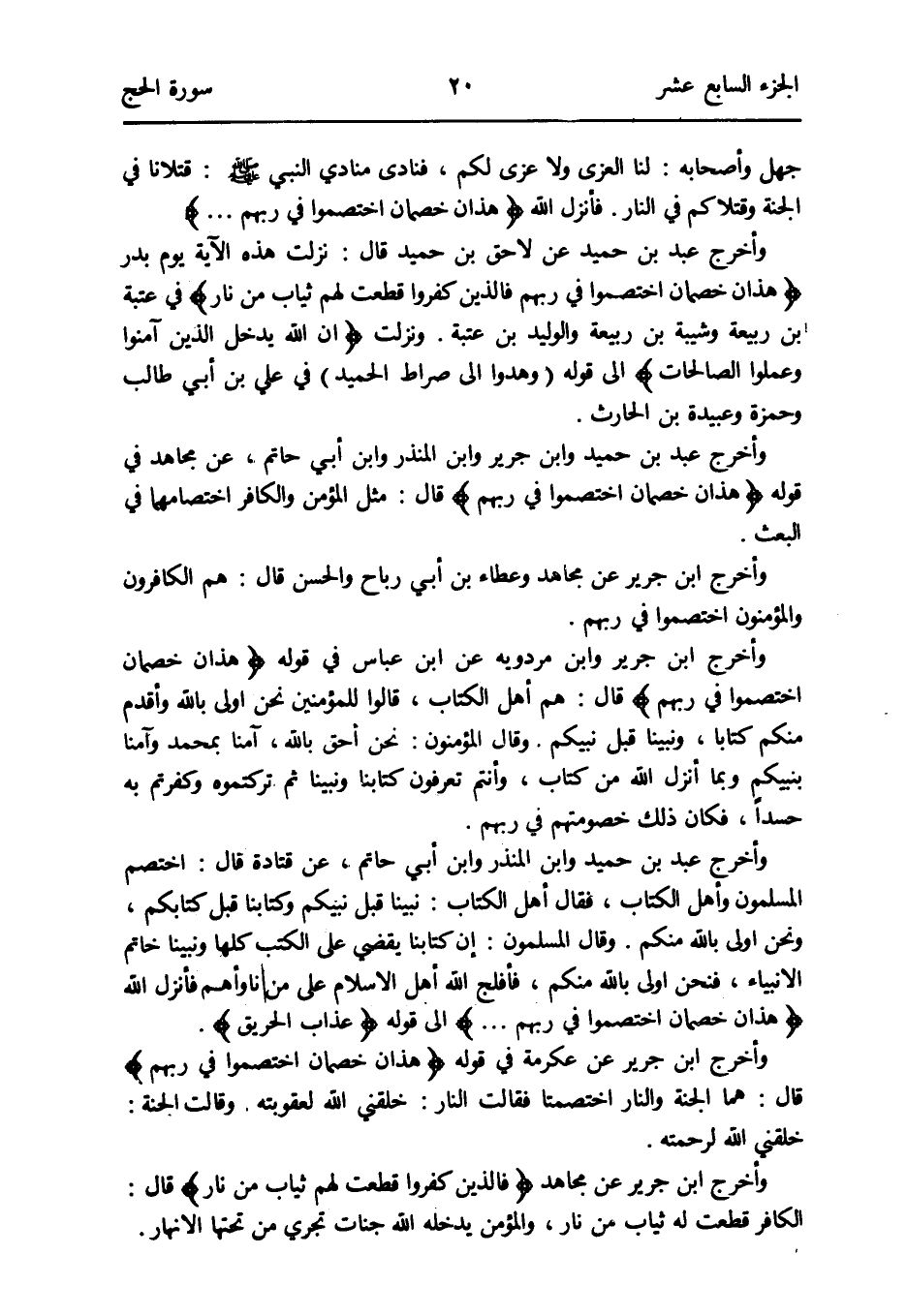 وَأخرج ابْن جرير عَن عِكْرِمَة فِي قَوْله {هَذَانِ خصمان اخْتَصَمُوا فِي رَبهم} قَالَ: هما الْجنَّة وَالنَّار اختصمتا فَقَالَت النَّار: خلقني الله لعقوبته