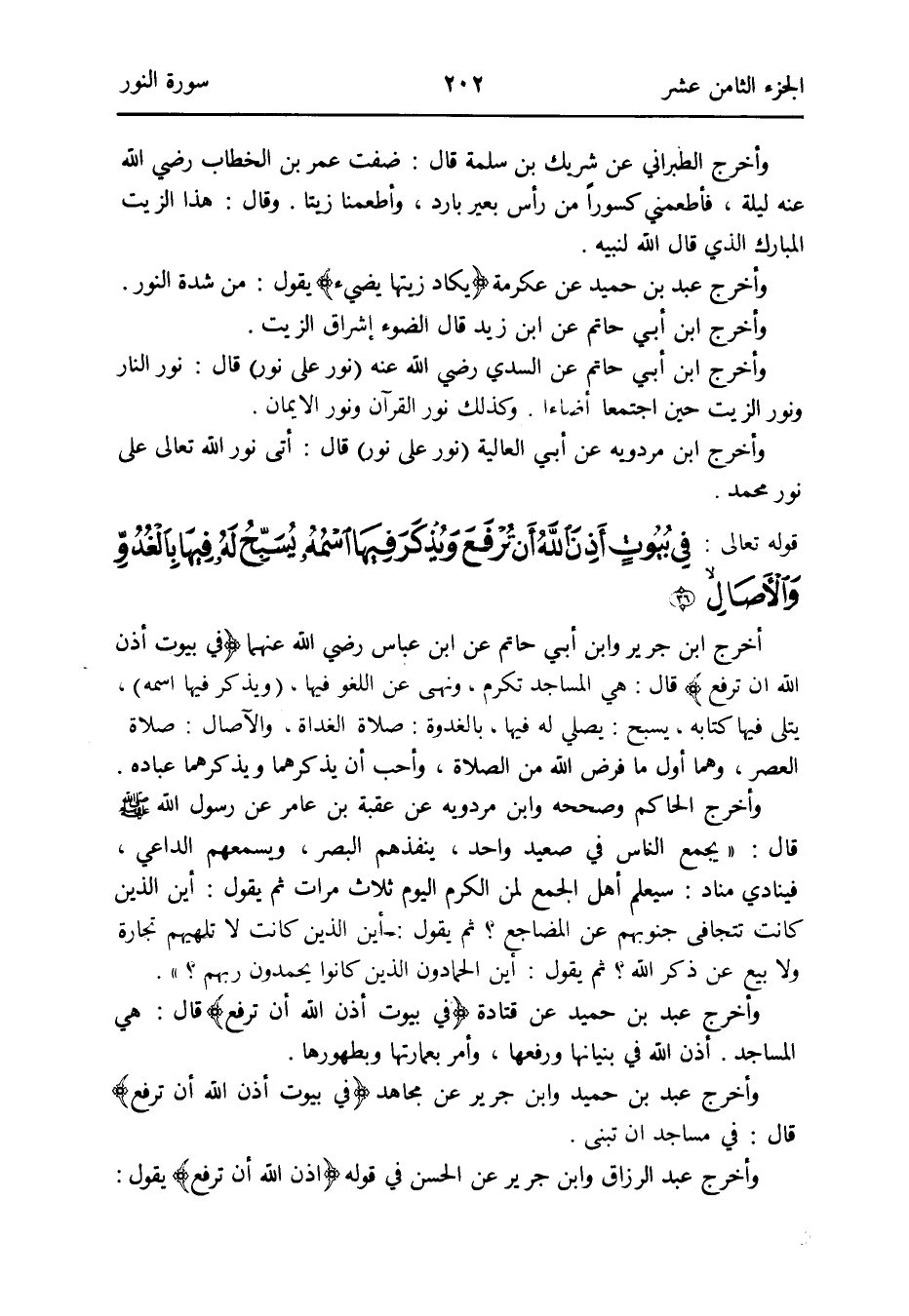 - قَوْله تَعَالَى: فِي بيُوت أذن الله أَن ترفع وَيذكر فِيهَا اسْمه يسبح لَهُ فِيهَا بالغدوّ وَالْآصَال