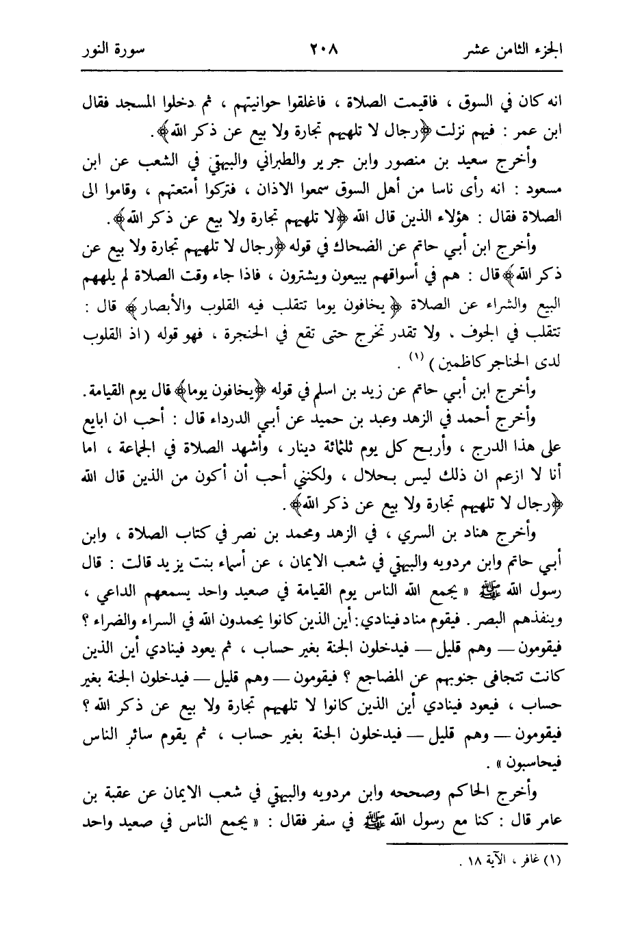 وَأخرج سعيد بن مَنْصُور وَابْن جرير وَالطَّبَرَانِيّ وَالْبَيْهَقِيّ فِي الشّعب عَن ابْن مَسْعُود أَنه رأى نَاسا من أهل السُّوق سمعُوا الْأَذَان فتركوا أمتعتهم وَقَامُوا إِلَى الصَّلَاة فَقَالَ: هَؤُلَاءِ الَّذين قَالَ الله {لَا تُلْهِيهِمْ تِجَارَة وَلَا بيع عَن ذكر الله}