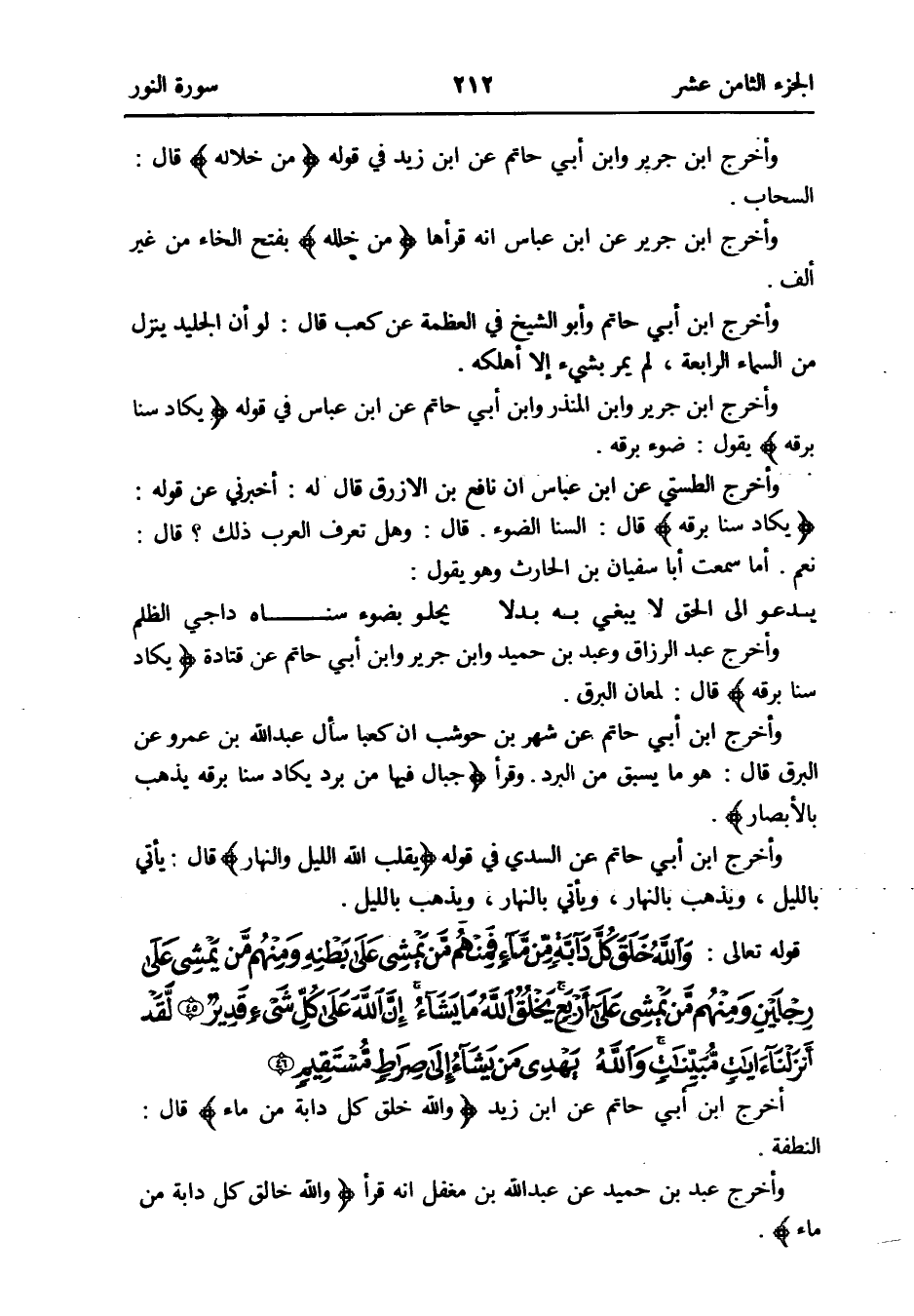 وَأخرج ابْن جرير وَابْن الْمُنْذر وَابْن أبي حَاتِم عَن ابْن عَبَّاس فِي قَوْله {يكَاد سنا برقه} يَقُول: ضوء برقه