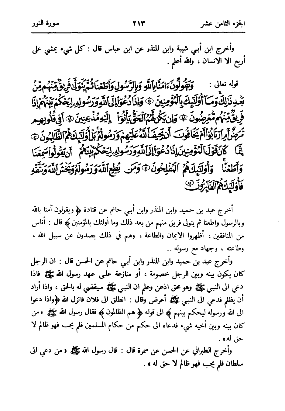 - قَوْله تَعَالَى: وَيَقُولُونَ آمنا بِاللَّه وبالرسول وأطعنا ثمَّ يتَوَلَّى فريق مِنْهُم من بعد ذَلِك وَمَا أُولَئِكَ بِالْمُؤْمِنِينَ وَإِذا دعوا إِلَى الله وَرَسُوله ليحكم بَينهم إِذا فريق مِنْهُم معرضون وَإِن يكن لَهُم يَأْتُوا إِلَيْهِ مذعنين أَفِي قُلُوبهم مرض أم ارْتَابُوا أم يخَافُونَ أَن يَحِيف الله عَلَيْهِم وَرَسُوله بل أُولَئِكَ هم الظَّالِمُونَ أَنما كَانَ قَول الْمُؤمنِينَ إِذا دعوا إِلَى الله وَرَسُوله ليحكم بَينهم أَن يَقُولُوا سمعنَا وأطعنا وَأُولَئِكَ هم المفلحون وَمن يطع الله وَرَسُوله ويخشى الله ويتقه فَأُولَئِك هم الفائزون