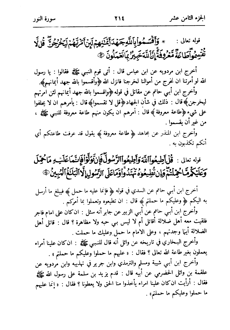 - قَوْله تَعَالَى: قل أطِيعُوا الله وَأَطيعُوا الرَّسُول فَإِن توَلّوا فَإِنَّمَا عَلَيْهِ مَا حمل وَعَلَيْكُم مَا حملتم وَإِن تطيعوه تهتدوا وَمَا على الرَّسُول إِلَّا الْبَلَاغ الْمُبين