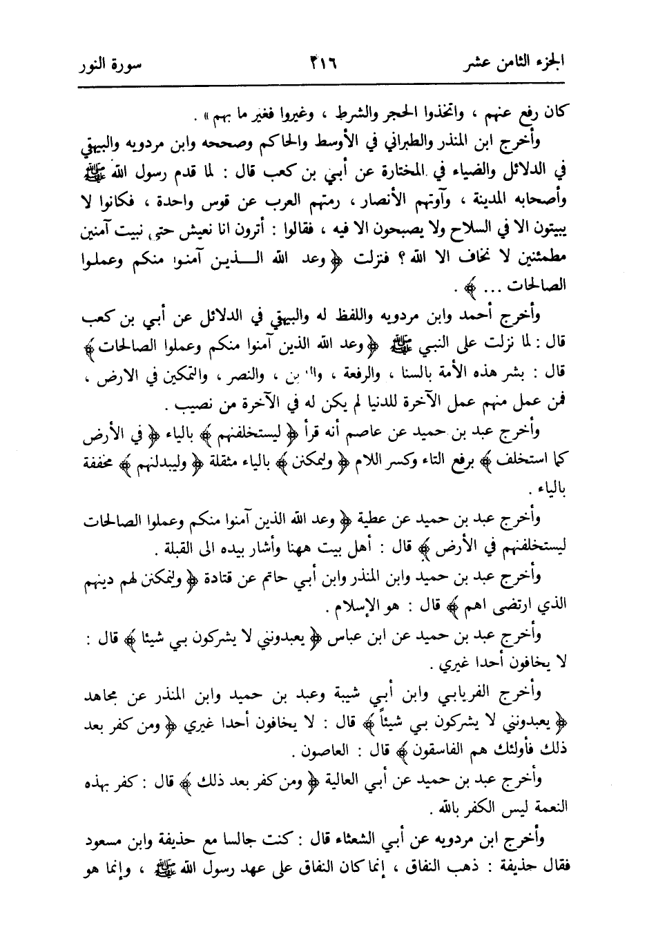وَأخرج الْفرْيَابِيّ وَابْن أبي شيبَة وَعبد بن حميد وَابْن الْمُنْذر عَن مُجَاهِد {يعبدونني لَا يشركُونَ بِي شَيْئا} قَالَ: لَا يخَافُونَ أحدا غَيْرِي {وَمن كفر بعد ذَلِك فَأُولَئِك هم الْفَاسِقُونَ} قَالَ: العاصون