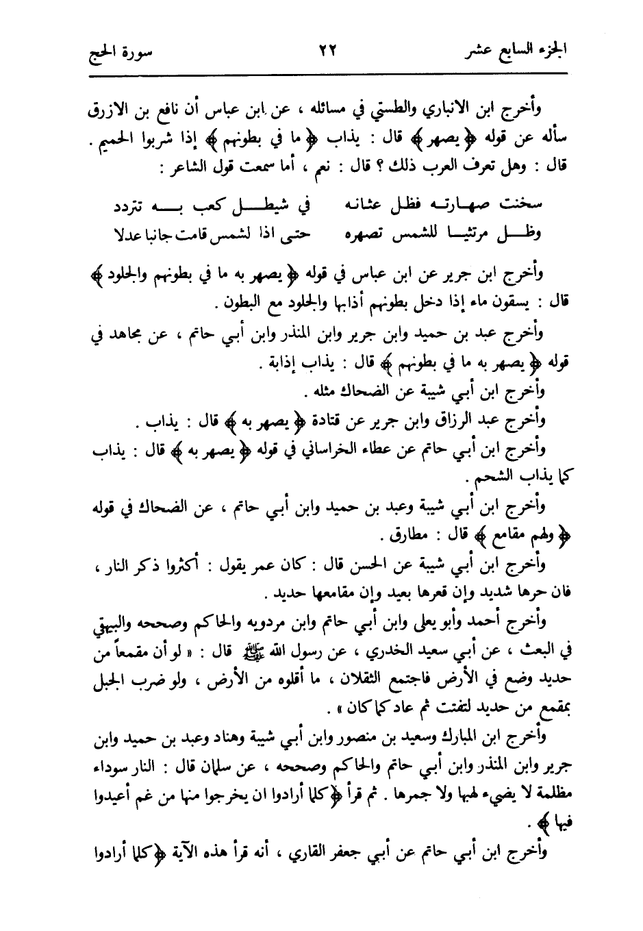 قَالَ: وَهل تعرف الْعَرَب ذَلِك قَالَ: نعم أما سَمِعت قَول الشَّاعِر: سخنت صهارته فظل عثانه فِي شيطل كَعْب بِهِ تَتَرَدَّد وظل مرتثياً للشمس تصهره حَتَّى اذا لشمس قَامَت جانباً عدلا وَأخرج ابْن جرير عَن ابْن عَبَّاس فِي قَوْله {يصهر بِهِ مَا فِي بطونهم والجلود} قَالَ: يسقون مَاء إِذا دخل بطونهم أذابها والجلود مَعَ الْبُطُون