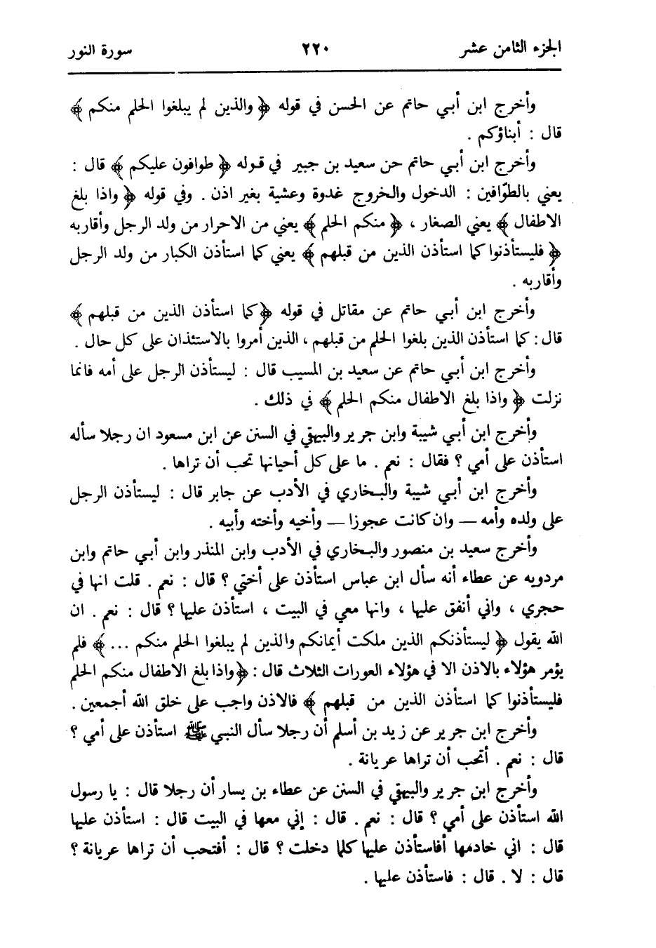 وَأخرج ابْن أبي حَاتِم عَن مقَاتل فِي قَوْله {كَمَا اسْتَأْذن الَّذين من قبلهم} قَالَ: كَمَا اسْتَأْذن الَّذين بلغُوا الْحلم من قبلهم الَّذين أمروا بالاستئذان على كل حَال