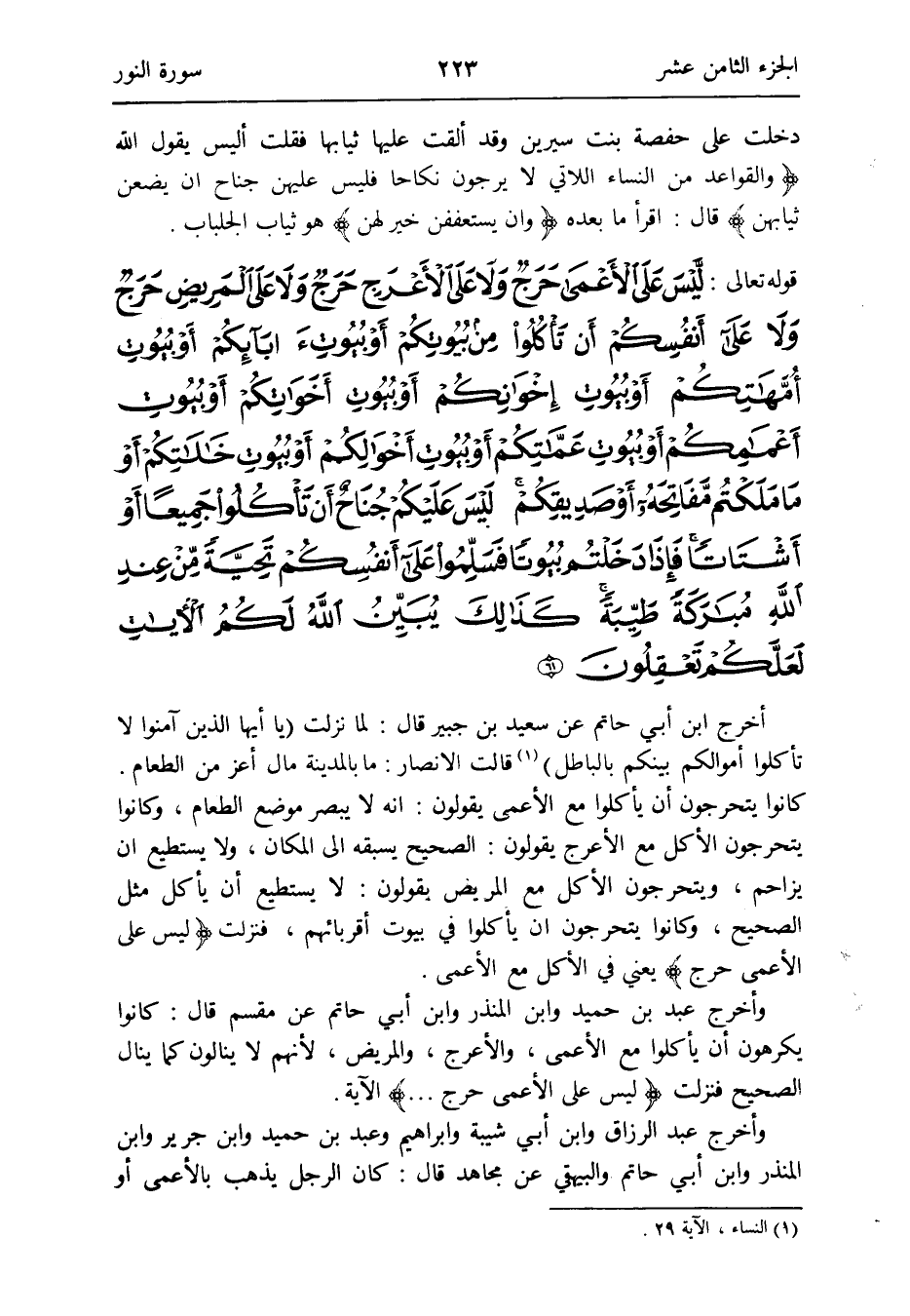 - قَوْله تَعَالَى: لَيْسَ على الْأَعْمَى حرج وَلَا على الْأَعْرَج حرج وَلَا على الْمَرِيض حرج وَلَا على أَنفسكُم أَن تَأْكُلُوا من بُيُوتكُمْ أَو بيُوت آبائكم أَو بيُوت أُمَّهَاتكُم أَو بيُوت إخْوَانكُمْ أَو بيُوت أخواتكم أَو بيُوت أعمامكم أَو بيُوت عماتكم أَو بيُوت أخوالكم أَو بيُوت خالاتكم أَو مَا ملكتم مفاتحه أَو صديقكم لَيْسَ عَلَيْكُم جنَاح أَن تَأْكُلُوا جَمِيعًا أَو أشتاتا فَإِذا دَخَلْتُم بُيُوتًا فَسَلمُوا على أَنفسكُم تَحِيَّة من عِنْد الله مباركة طيبَة كَذَلِك يبين الله لكم الْآيَات لَعَلَّكُمْ تعقلون