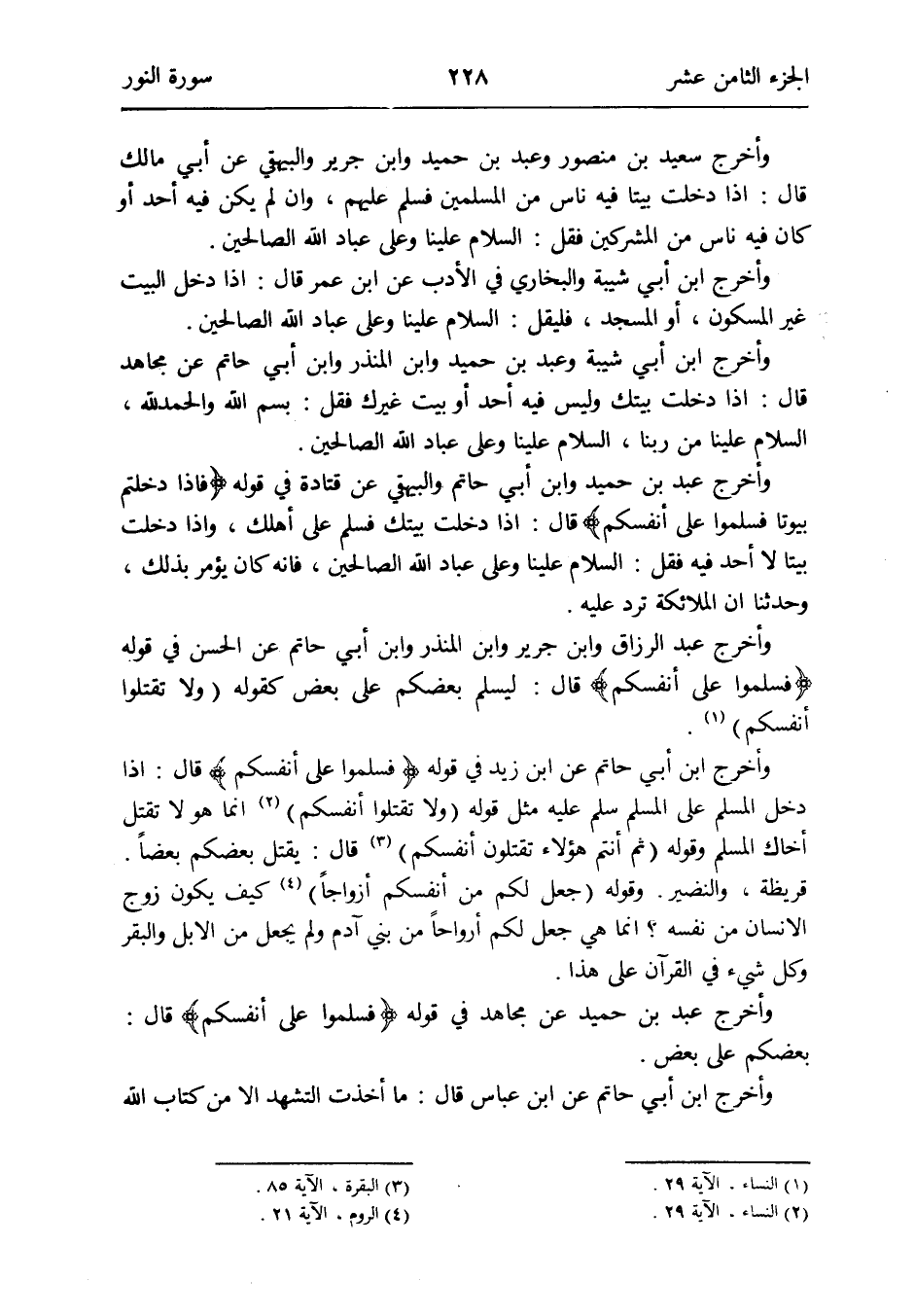 وَأخرج ابْن أبي حَاتِم عَن ابْن زيد فِي قَوْله {فَسَلمُوا على أَنفسكُم} قَالَ: إِذا دخل الْمُسلم على الْمُسلم سلم عَلَيْهِ مثل قَوْله {وَلَا تقتلُوا أَنفسكُم} النِّسَاء الْآيَة 29 إِنَّمَا هُوَ لَا تقتل أَخَاك الْمُسلم وَقَوله {ثمَّ أَنْتُم هَؤُلَاءِ تقتلون أَنفسكُم} الْبَقَرَة الْآيَة 85 قَالَ: يقتل بَعْضكُم بَعْضًا