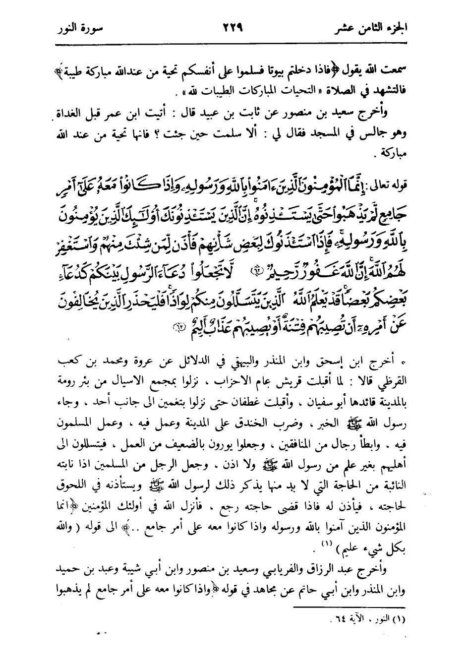 - قَوْله تَعَالَى: إِنَّمَا الْمُؤْمِنُونَ الَّذين آمنُوا بِاللَّه وَرَسُوله وَإِذا كَانُوا مَعَه على أَمر جَامع لم يذهبوا حَتَّى يستأذنوه إِن الَّذين يَسْتَأْذِنُونَك أُولَئِكَ الَّذين يُؤمنُونَ بِاللَّه وَرَسُوله فَإِذا استأذنوك لبَعض شَأْنهمْ فَأذن لمن شِئْت مِنْهُم واستغفرلهم الله إِن الله غَفُور رَحِيم لاتجعلوا دُعَاء الرَّسُول بَيْنكُم كدعاء بَعْضكُم بَعْضًا قد يعلم الله الَّذين يَتَسَلَّلُونَ مِنْكُم لِوَاذًا فليحذر الَّذين يخالفون عَن أمره أَن تصيبهم فتْنَة أَو يصيبهم عَذَاب أَلِيم