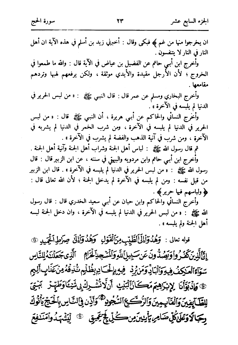 - قَوْله تَعَالَى: وهدوا إِلَى الطّيب من القَوْل وهدوا إِلَى صِرَاط الحميد إِن الَّذين كفرُوا ويصدون عَن سَبِيل الله وَالْمَسْجِد الْحَرَام الَّذِي جَعَلْنَاهُ للنَّاس سَوَاء العاكف فِيهِ والباد وَمن يرد فِيهِ بإلحاد بظُلْم نذقه من عَذَاب أَلِيم وَإِذ بوأنا لإِبراهيم مَكَان الْبَيْت أَن لَا تشرك بِي شَيْئا وطهر بَيْتِي للطائفين والقائمين والركع السُّجُود وَأذن فِي النَّاس بِالْحَجِّ يأتوك رجَالًا وعَلى كل ضامر يَأْتِين من كل فج عميق ليشهدوا مَنَافِع