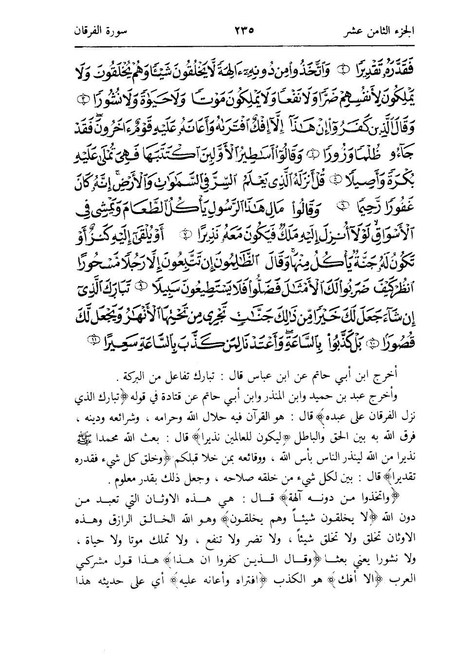 فقدره تَقْديرا وَاتَّخذُوا من دونه آلِهَة لَا يخلقون شَيْئا وهم يخلقون وَلَا يملكُونَ لأَنْفُسِهِمْ ضرا ولانفعا وَلَا يملكُونَ موتا ولاحياة وَلَا نشورا وَقَالَ الَّذين كفرُوا إِن هَذَا إِلَّا إفْك افتراه وأعانه عَلَيْهِ قوم آخَرُونَ فقد جاؤوا ظلما وزوراً وَقَالُوا أساطير الْأَوَّلين اكتتبها فَهِيَ تملى عَلَيْهِ بكرَة وَأَصِيلا قل أنزلهُ الَّذِي يعلم السِّرّ فِي السَّمَوَات وَالْأَرْض إِنَّه كَانَ غَفُورًا رحِيما وَقَالُوا مَا لهَذَا الرَّسُول يَأْكُل الطَّعَام وَيَمْشي فِي الْأَسْوَاق لَوْلَا أنزل إِلَيْهِ ملك فَيكون مَعَه نذيراً أَو يلقى إِلَيْهِ كنز أَو تكون لَهُ جنَّة يَأْكُل مِنْهَا وَقَالَ الظَّالِمُونَ إِن تتبعون إِلَّا رجلا مسحورا أنظر كَيفَ ضربوا لَك الْأَمْثَال فضلوا فَلَا يَسْتَطِيعُونَ سَبِيلا تبَارك الَّذِي إِن شَاءَ جعل لَك خيرا من ذَلِك جنَّات تجْرِي من تحتهَا الْأَنْهَار وَيجْعَل لَك قصورا بل كذبُوا بالساعة واعتدنا لمن كذب بالساعة سعيرا