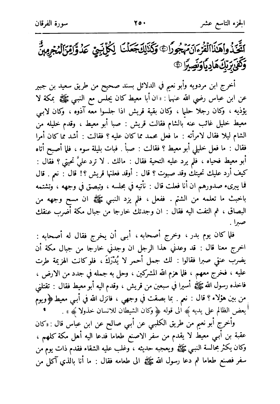 بِمَا بصقت فِي وَجْهي فَأنْزل الله فِي أبي معيط {وَيَوْم يعَض الظَّالِم على يَدَيْهِ} إِلَى قَوْله {وَكَانَ الشَّيْطَان للإِنسان خذولاً}